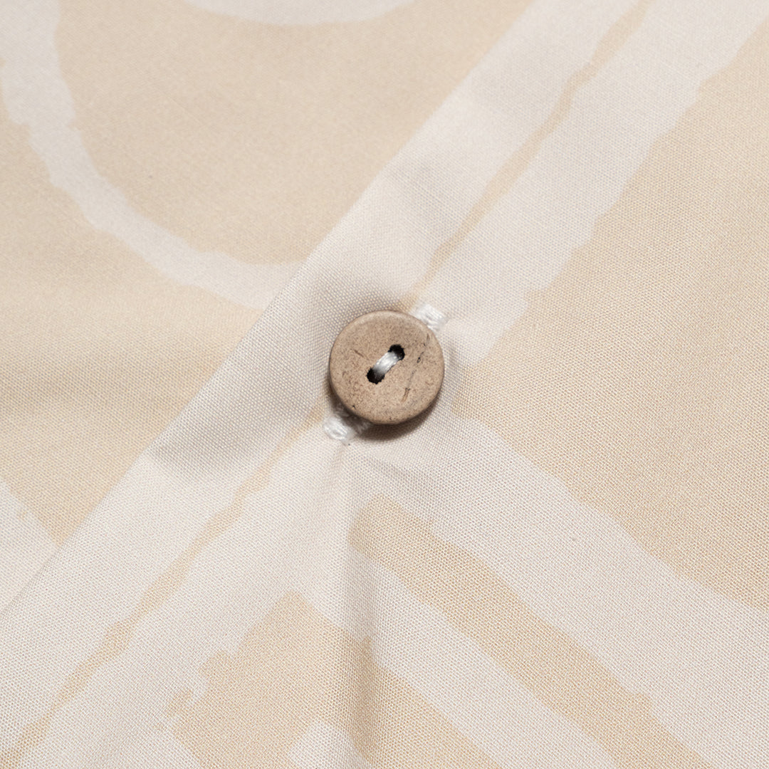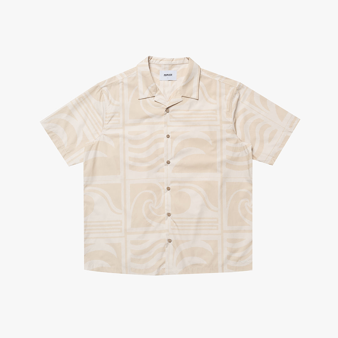 The Huntingdon Shirt in Beach. A Boxy fit shirt with a classic revere collar, made from a breathable 100% organic cotton poplin. Featuring a tonal all-over wave print, coconut button fastening and an embroidered logo on the hem.