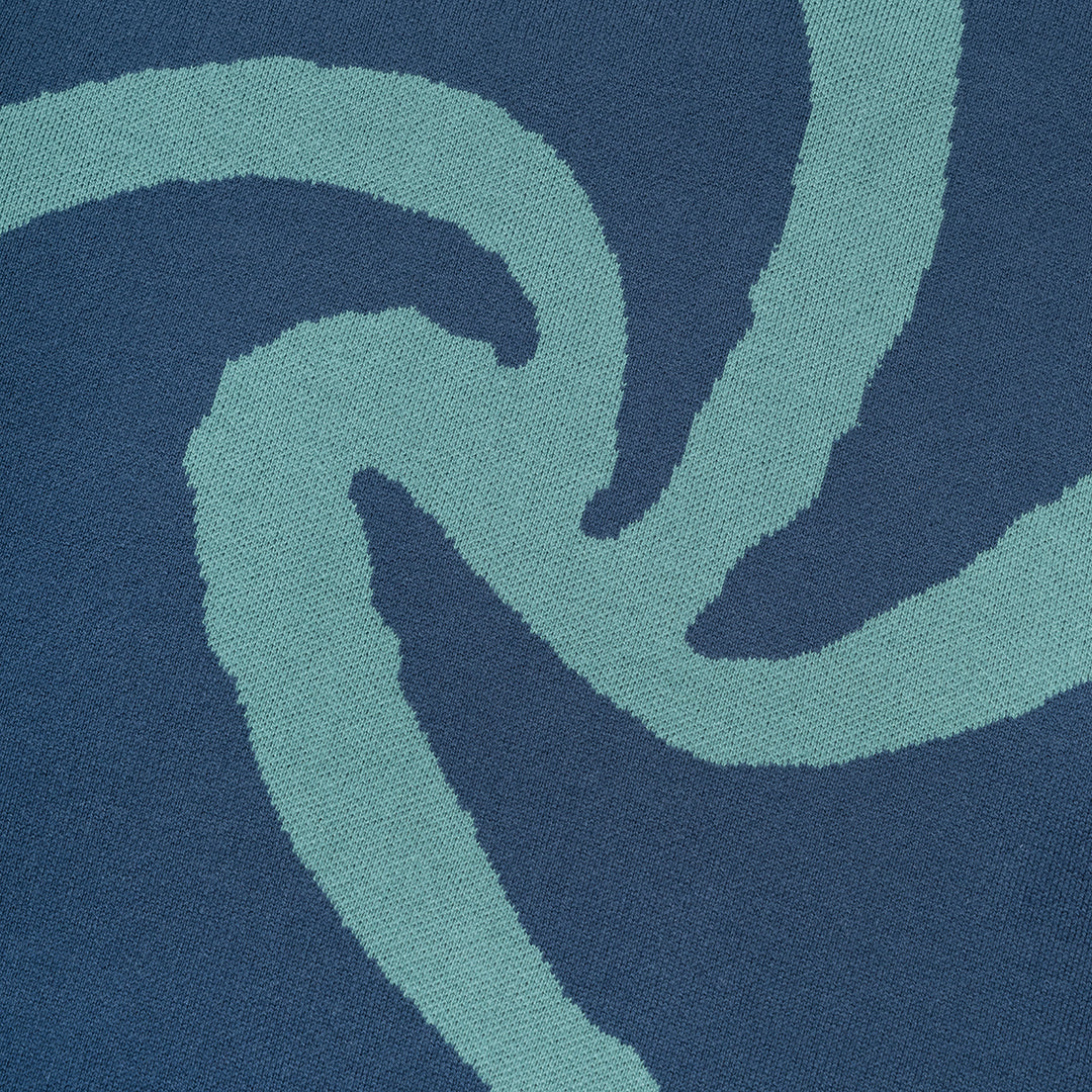 The Pacific Knit in Lagoon. A long-sleeve pullover crafted from soft-touch, 100% organic cotton. Designed with double-ribbed cuffs, hem and crewneck for a structured fit. Detailed with an intarsia spiral design and a seasonal woven patch on the hem.