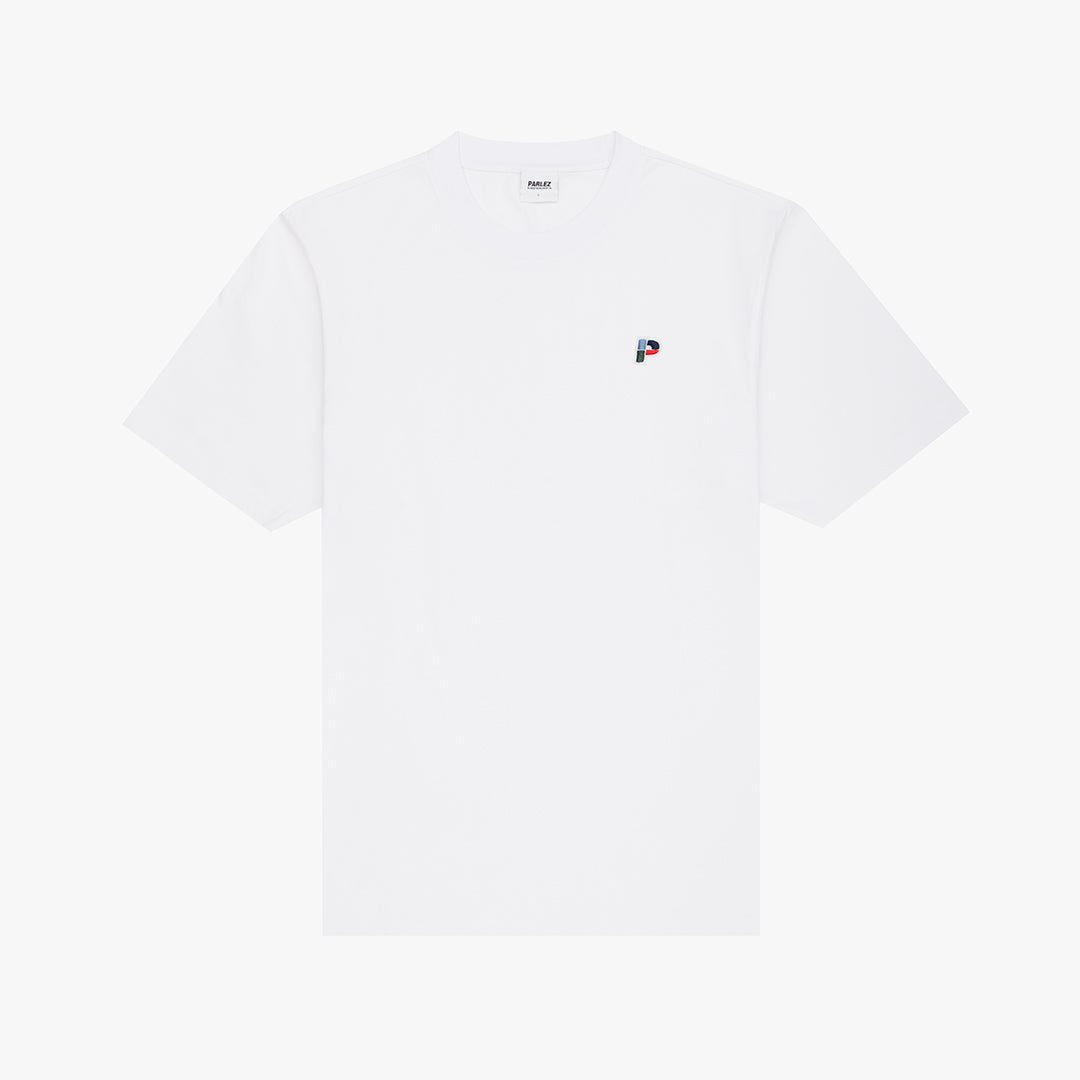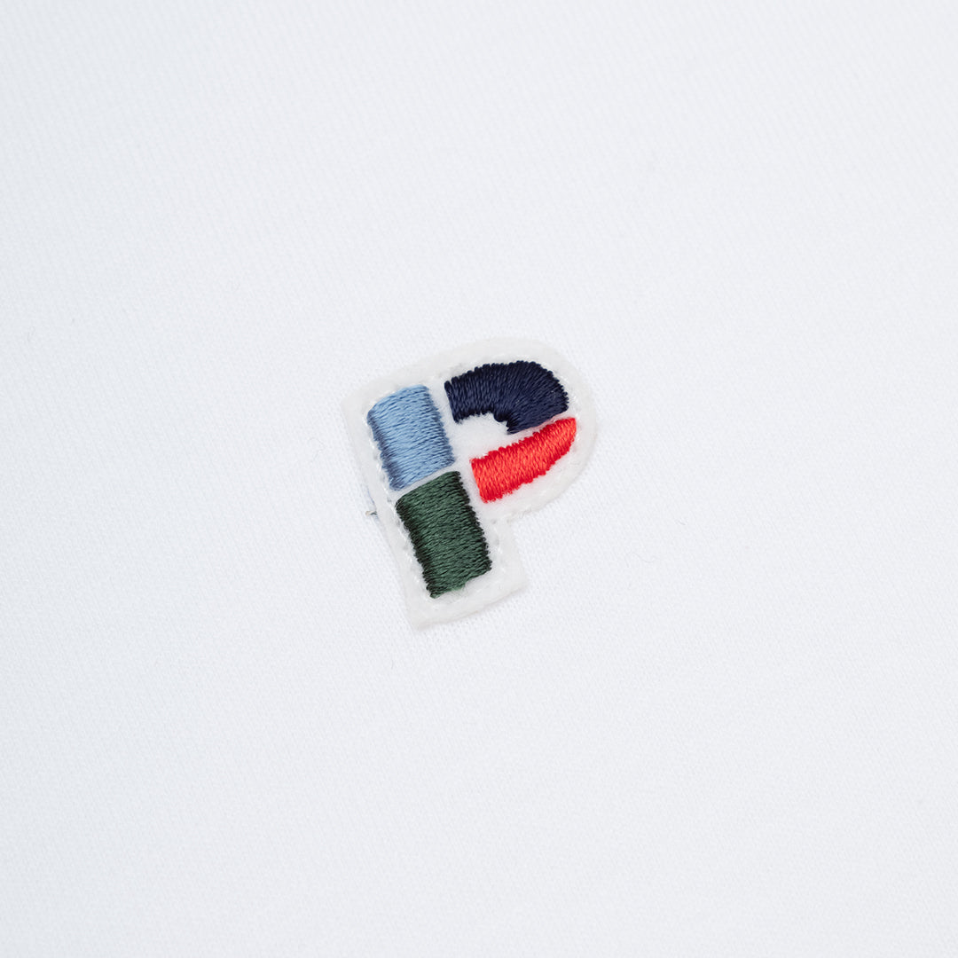 The Adduco T-Shirt in White. A short sleeve tee made from premium GOTS Certified, 100% organic cotton with a classic ribbed crewneck. Detailed with an embroidered 'P' patch on the chest.