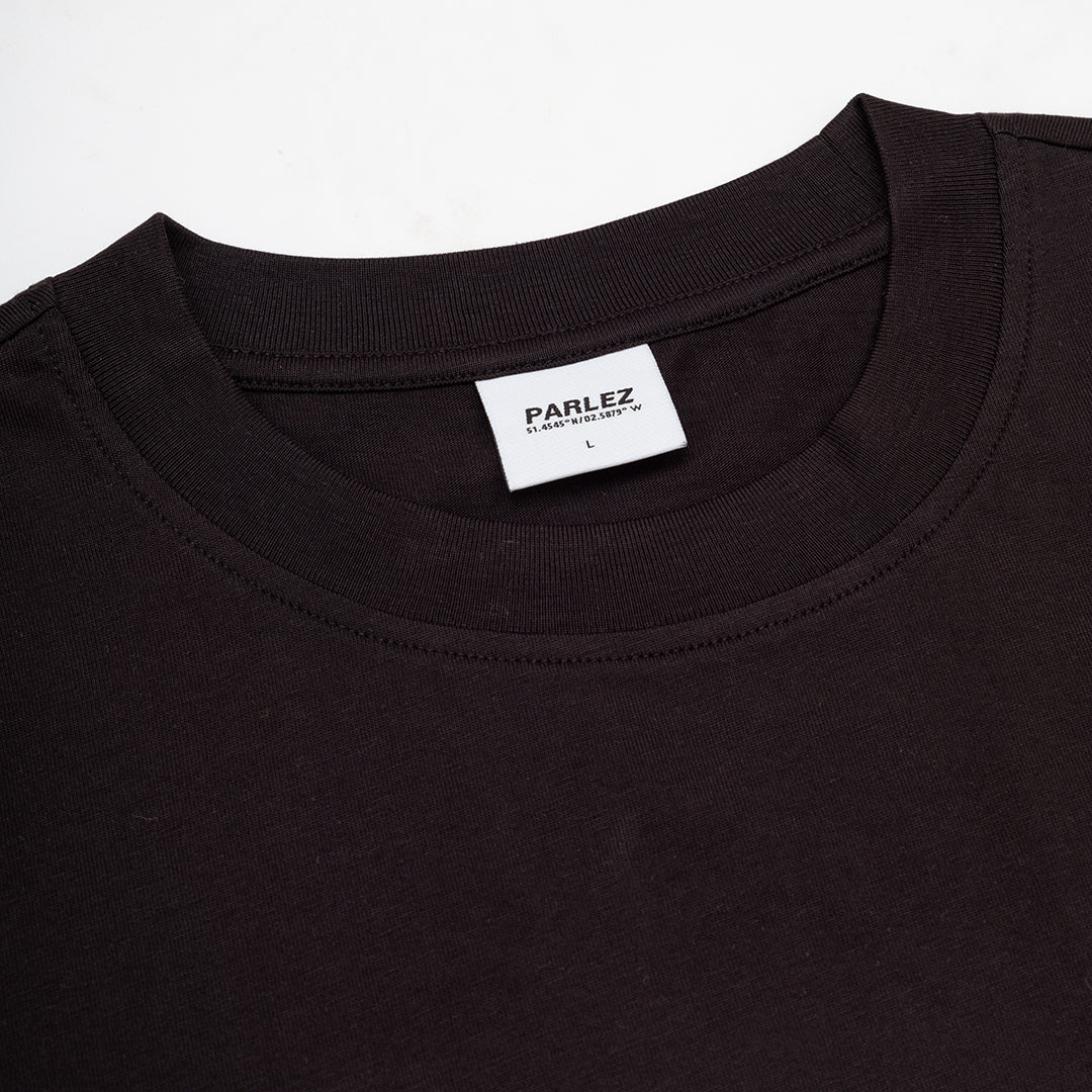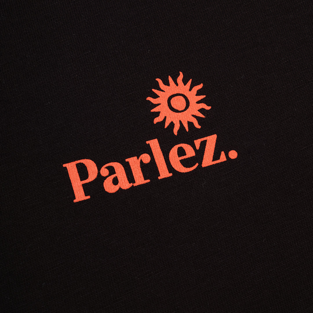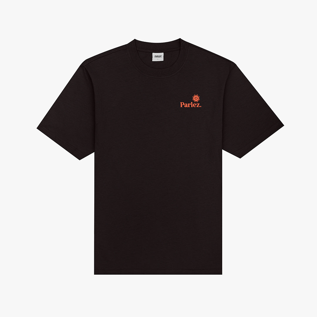 The Ador T-Shirt in Black. A short sleeve tee made from premium GOTS Certified, 100% organic cotton with a classic ribbed crewneck. Detailed with a small, printed logo on the chest and a large seasonal print on the back.