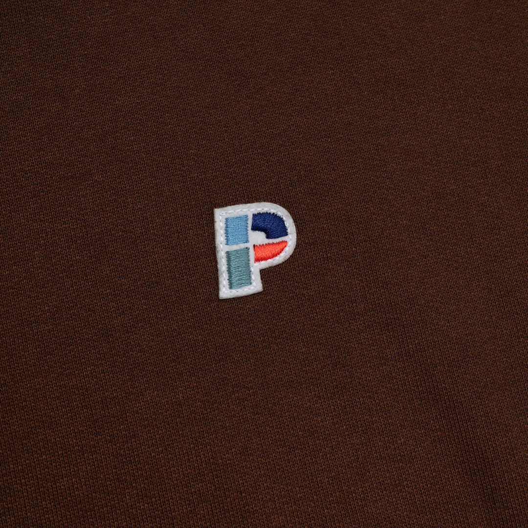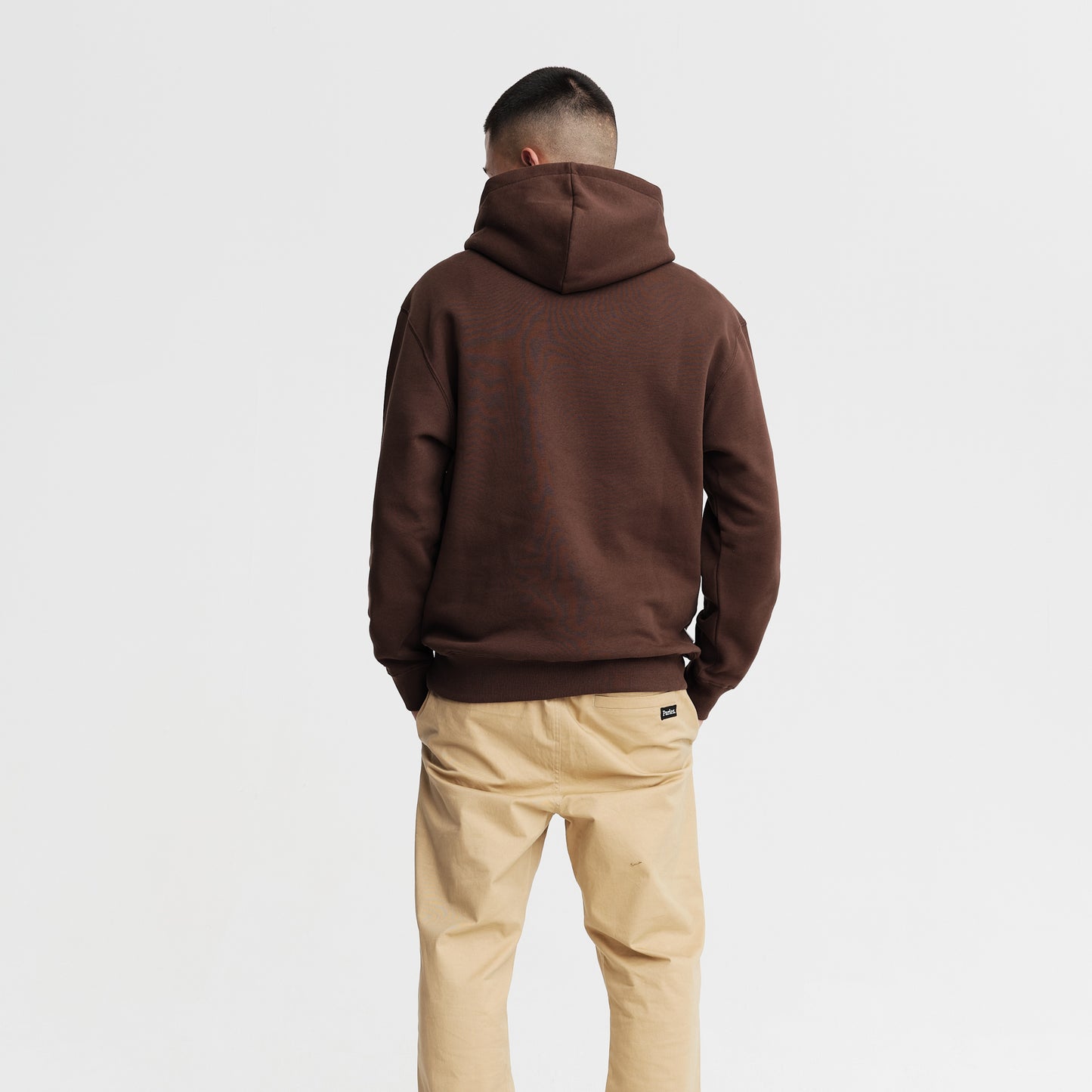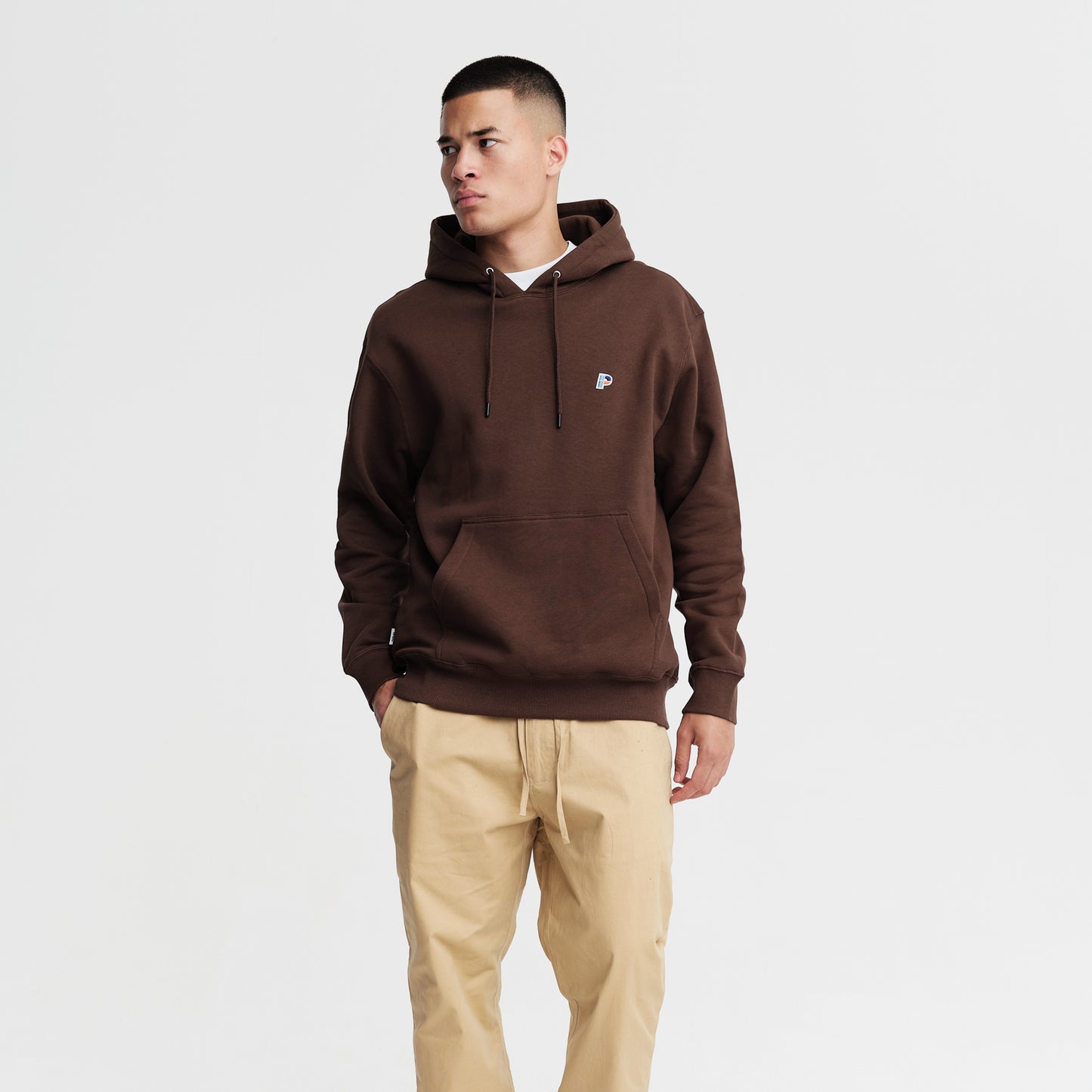 The Avery Hoodie in Mocha Brown. A brushed back pullover made from a soft, 100% organic cotton. Featuring a kangaroo pouch pocket, a drawstring hood with metal aglets and ribbed trims. Detailed with an embroidered 'P' patch on the chest.