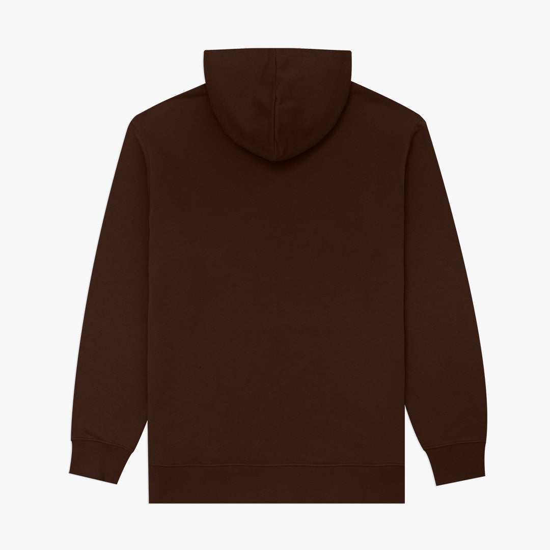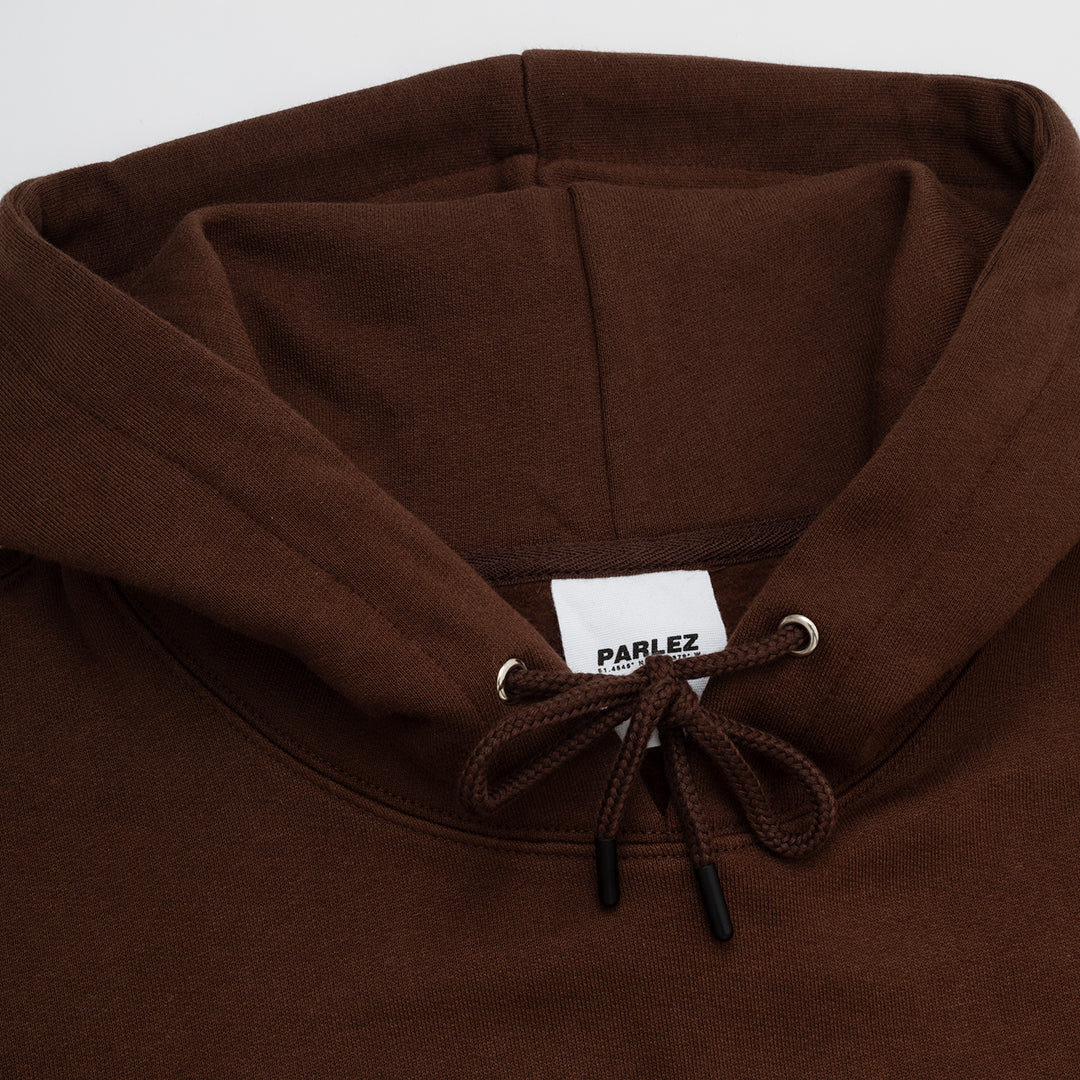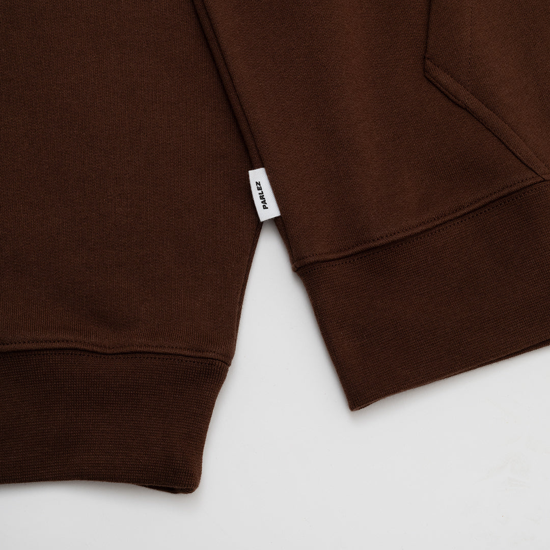 The Avery Hoodie in Mocha Brown. A brushed back pullover made from a soft, 100% organic cotton. Featuring a kangaroo pouch pocket, a drawstring hood with metal aglets and ribbed trims. Detailed with an embroidered 'P' patch on the chest.