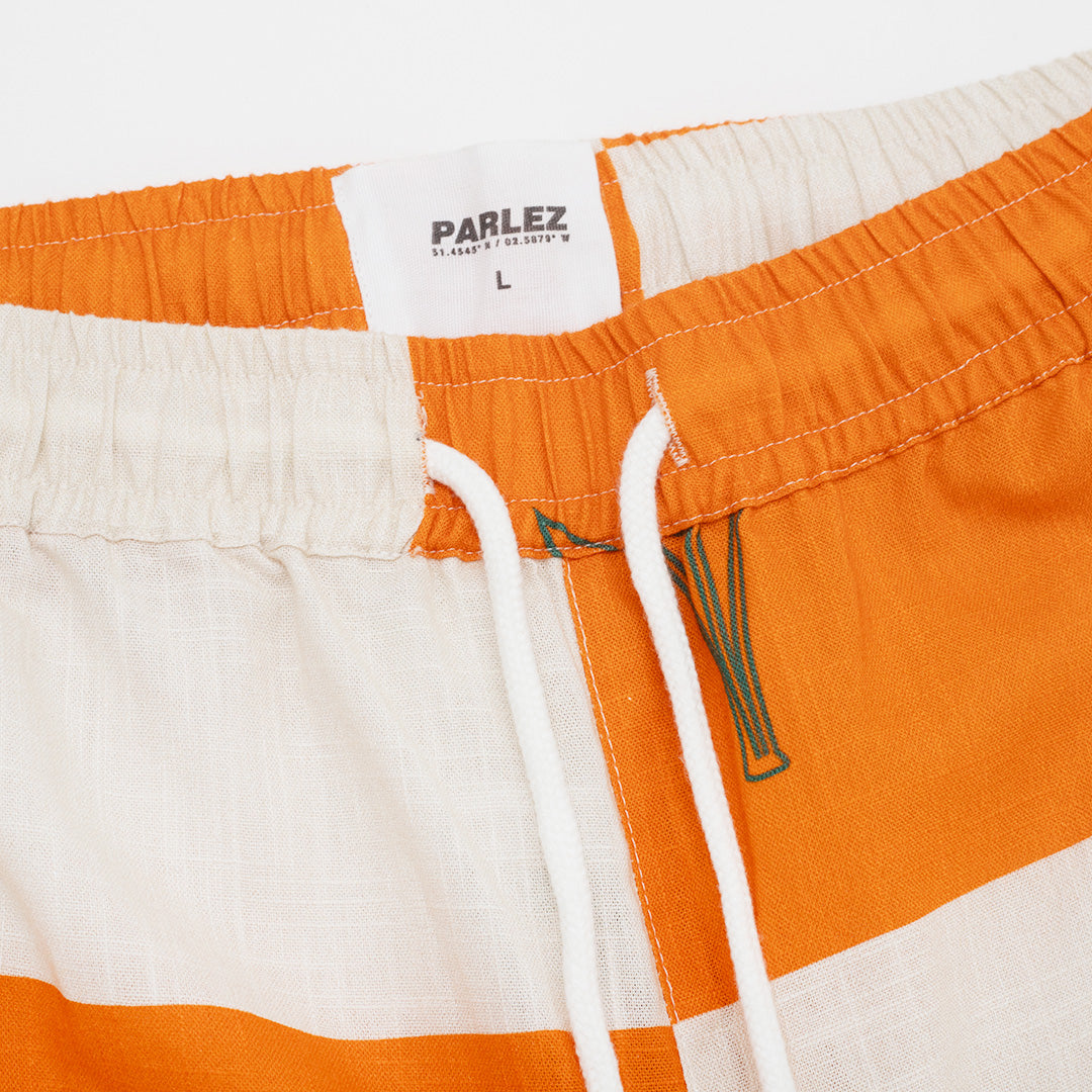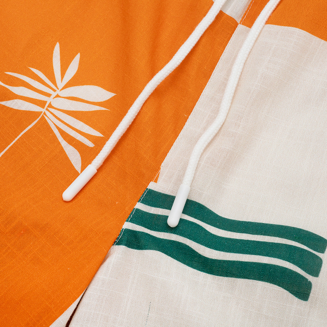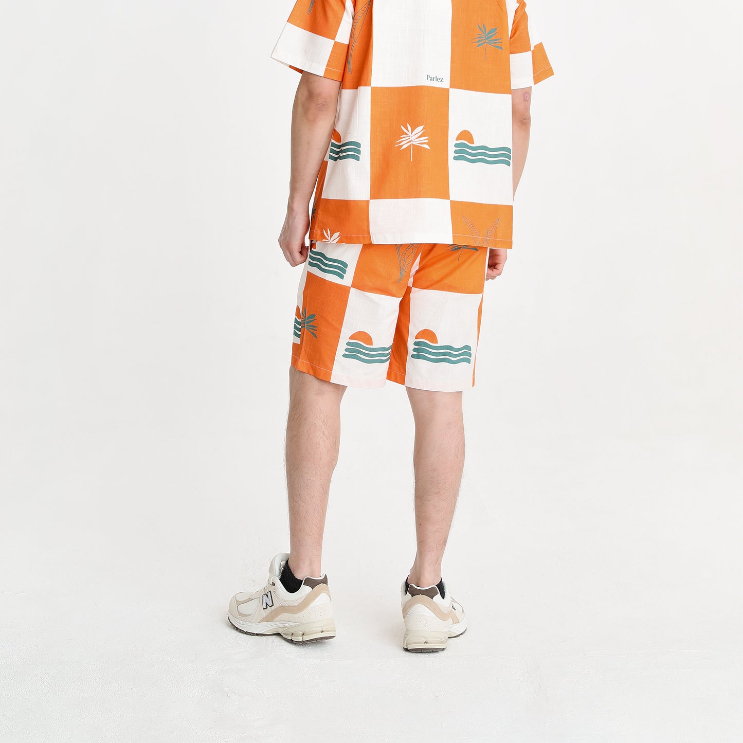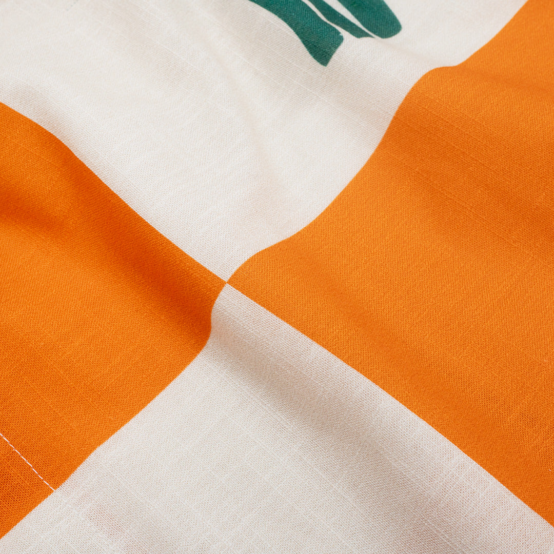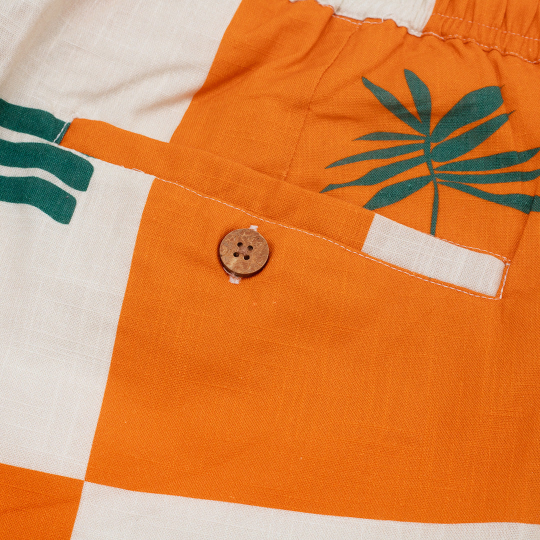 The Cabo Shorts in Orange. Relaxed fit shorts, made from a lightweight 100% organic cotton slub. Featuring an elasticated drawstring waist for an adjustable fit, two side entry pockets and two back pockets with coconut buttons. Detailed with an all-over check print with repeat illustrations.