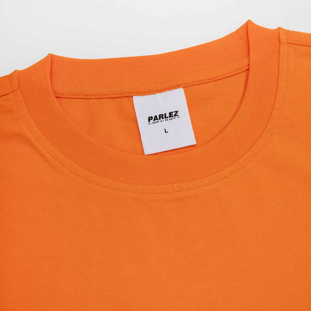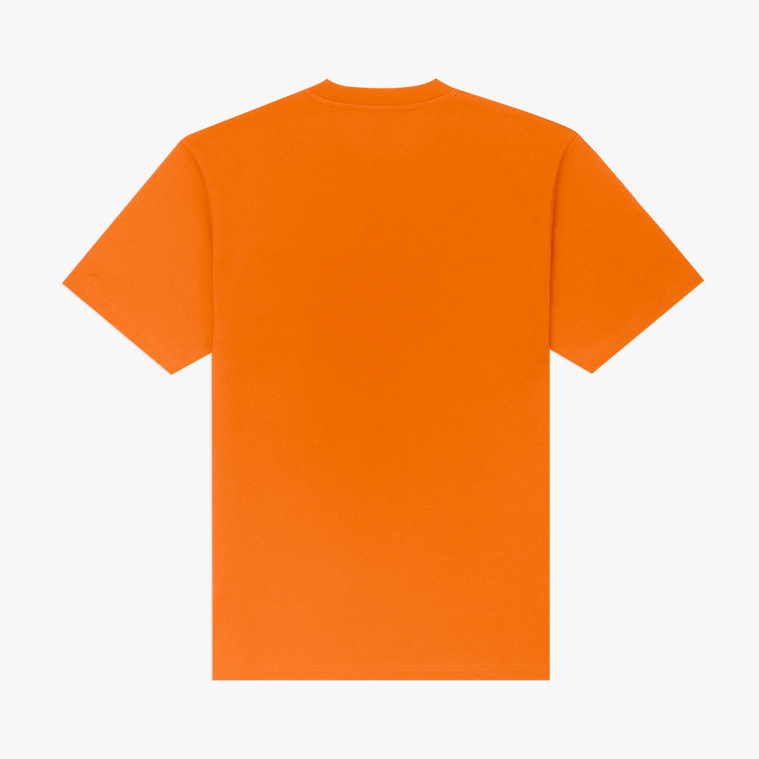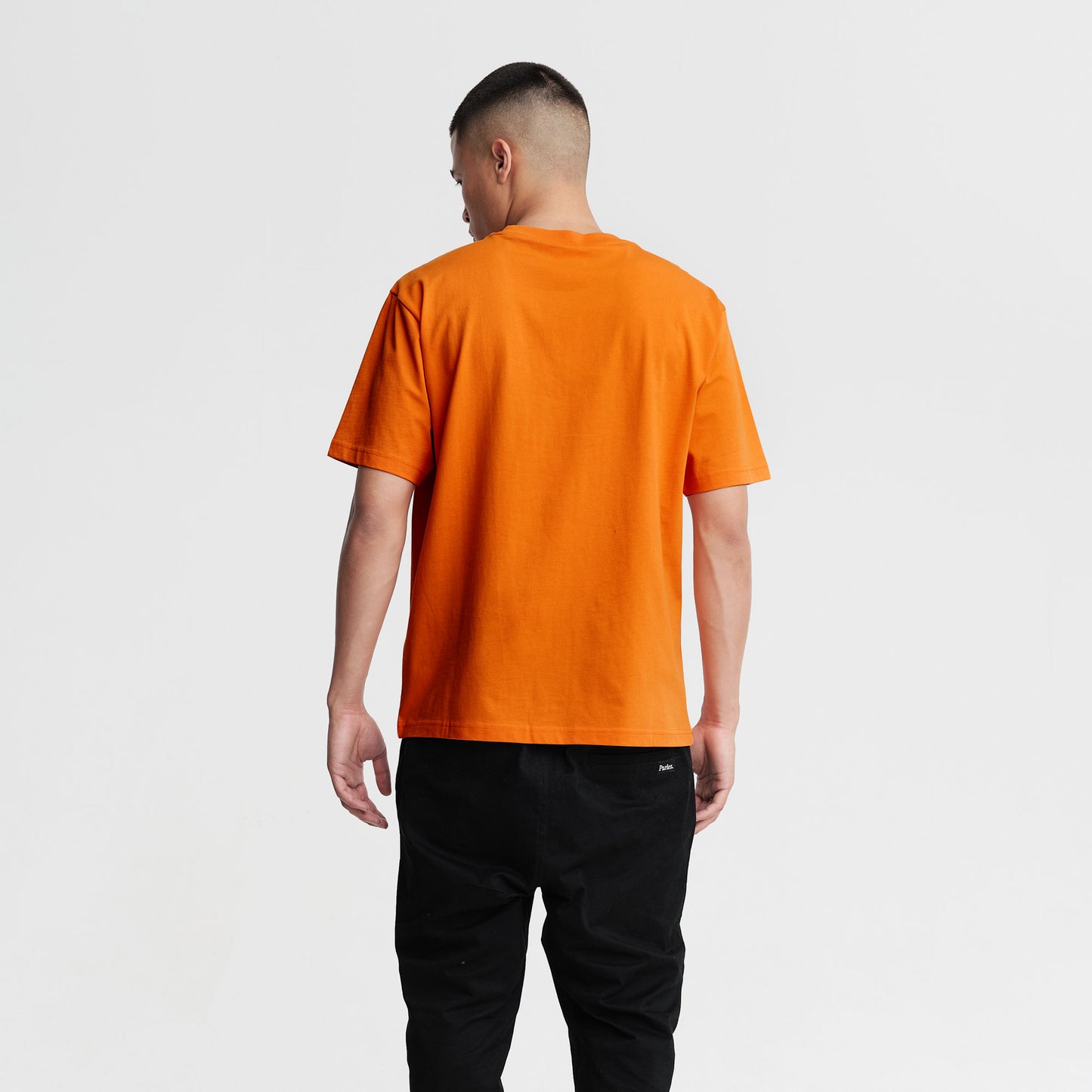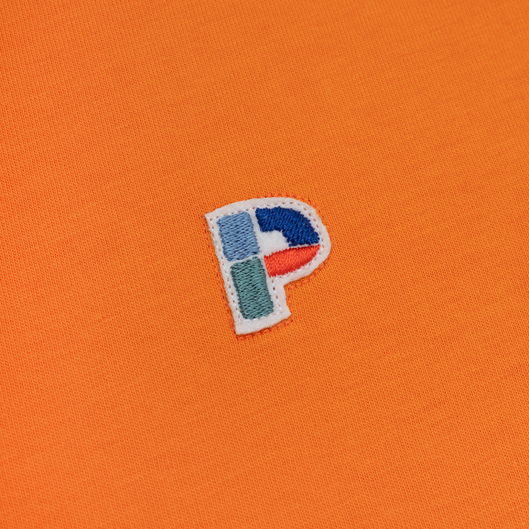 The Cinco T-Shirt in Tangerine. A short sleeve tee constructed from premium, GOTS Certified 100% organic cotton with a classic ribbed crewneck. Featuring a embroidered 'P' patch on the chest.