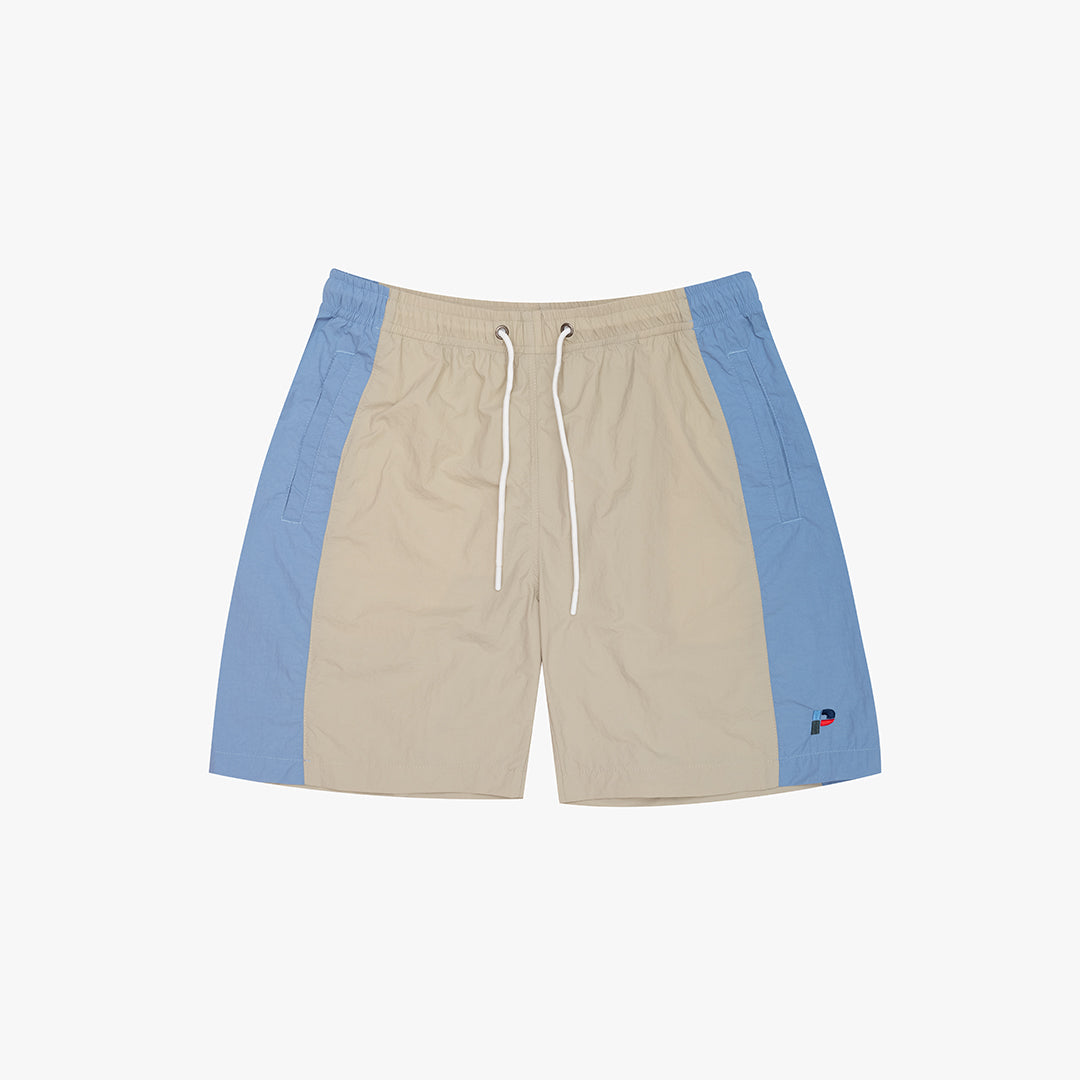 The Copa Shorts in Azzure. Relaxed fit shorts made from 100% recycled nylon with contrasting side panels. Featuring an elasticated drawstring waist for an adjustable fit, two welt front pockets and a single back pocket. Detailed with an embroidered 'P' Patch on the hem.