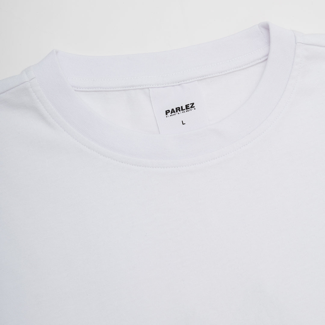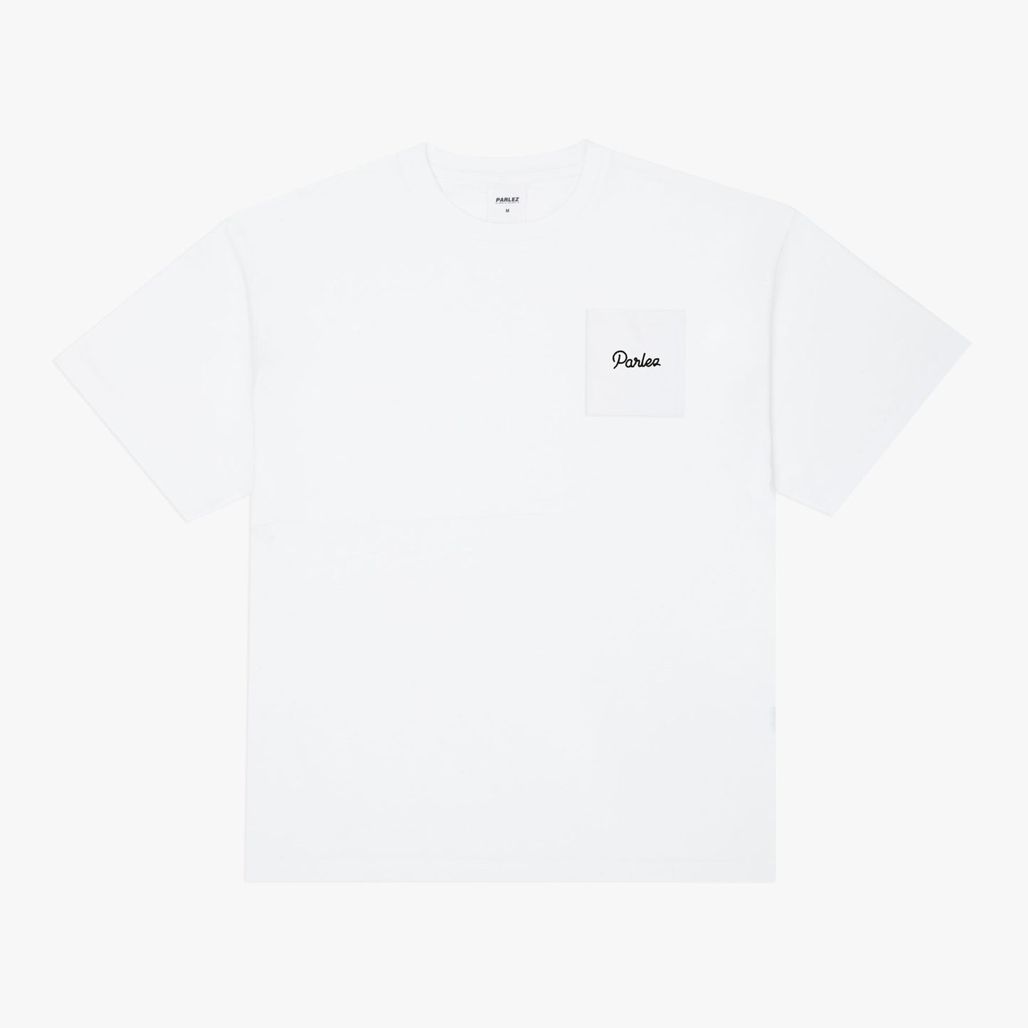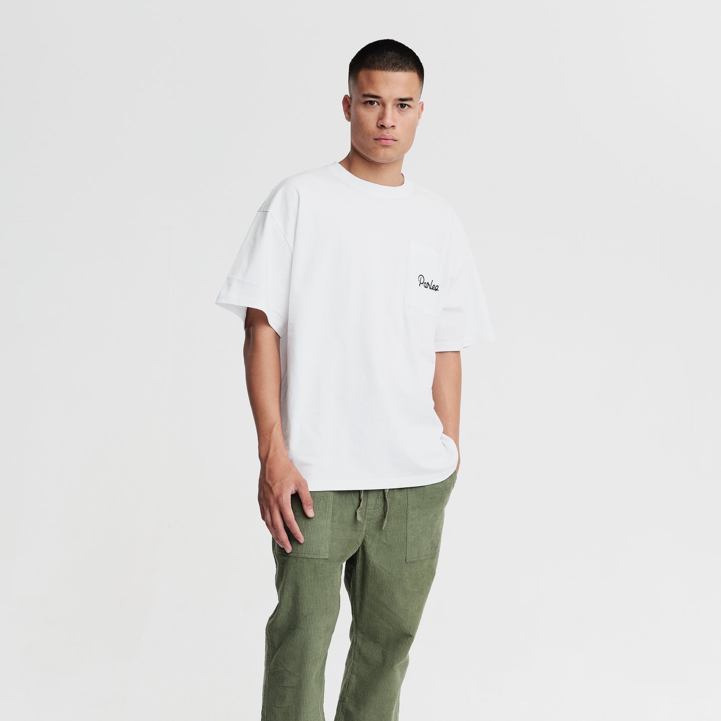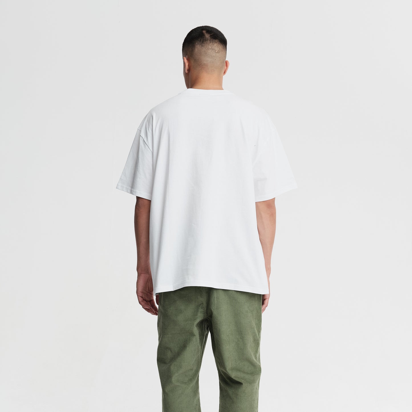 The Dale T-Shirt in White. A short sleeve, oversized tee constructed from premium 100% organic cotton with a classic ribbed crewneck. Featuring a chest pocket with embroidered chain stitch branding.