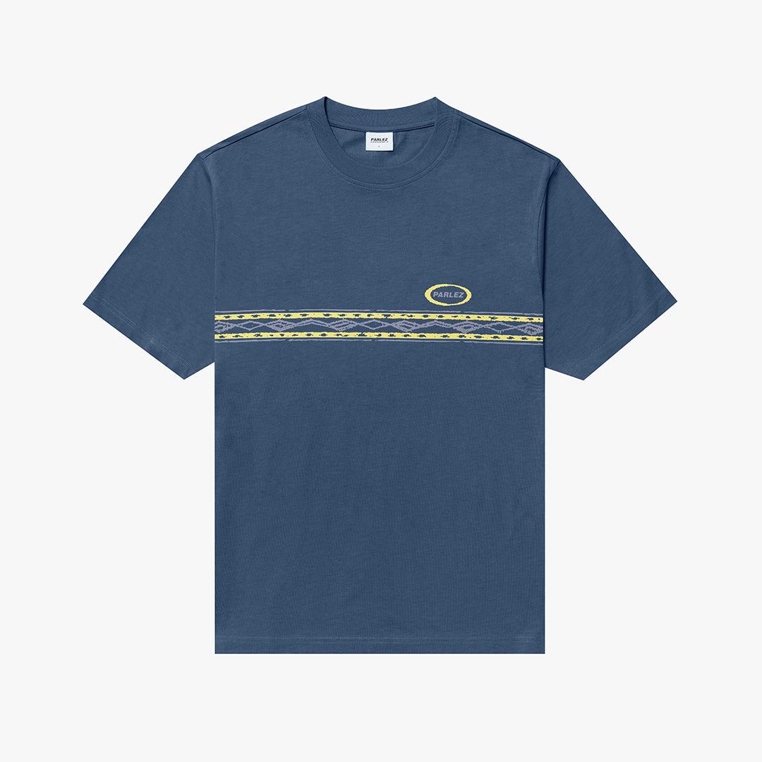 The Diego T-Shirt in Lagoon. A short sleeve tee crafted from premium GOTS Certified, 100% organic cotton with a classic ribbed crewneck. Detailed with a printed band across the chest.