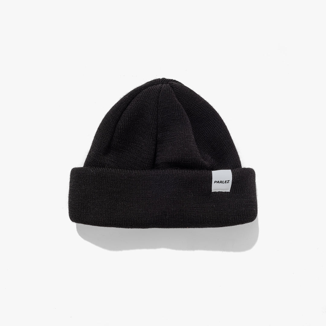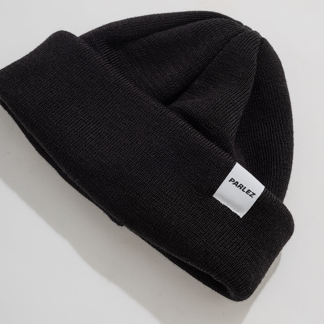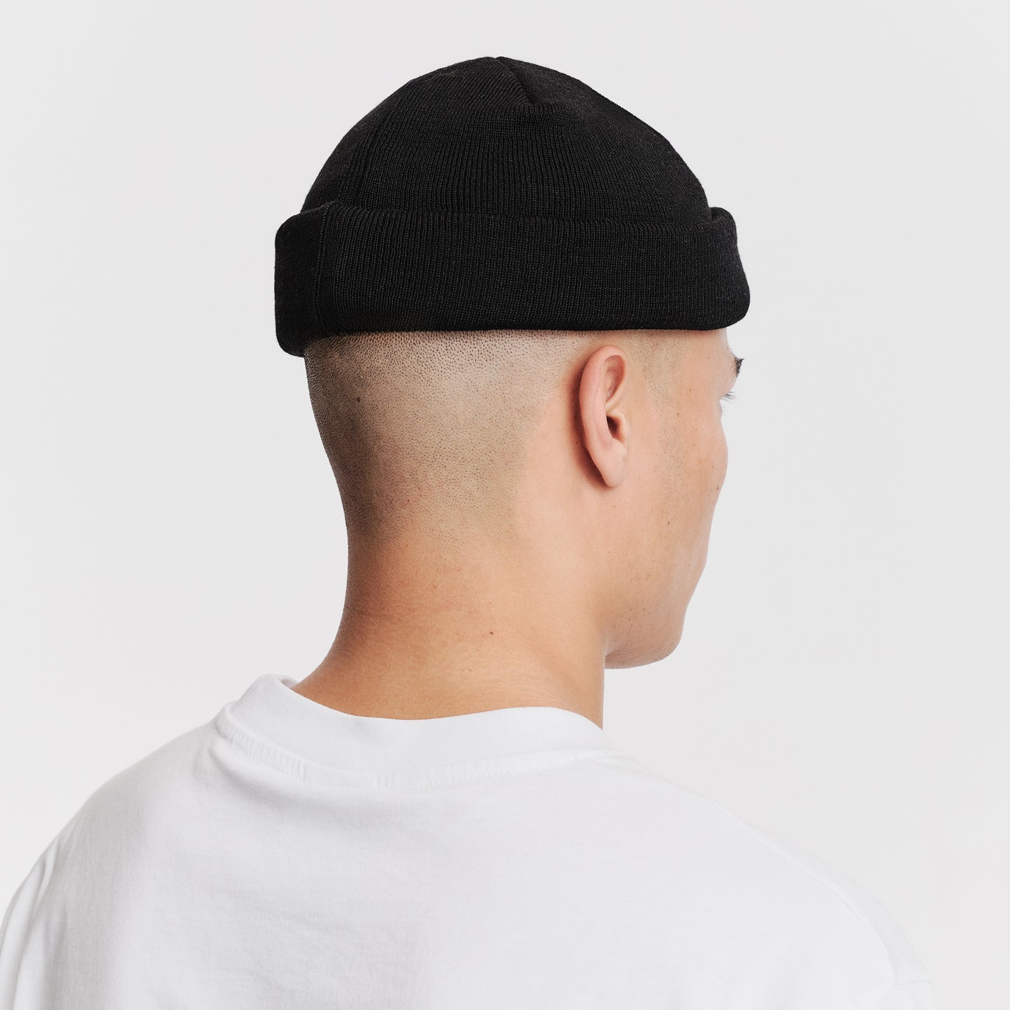 The Flatholm Beanie Hat in Black. A short-roll, ribbed beanie constructed from a warm, merino wool. Finished with a branded woven label on the cuff.