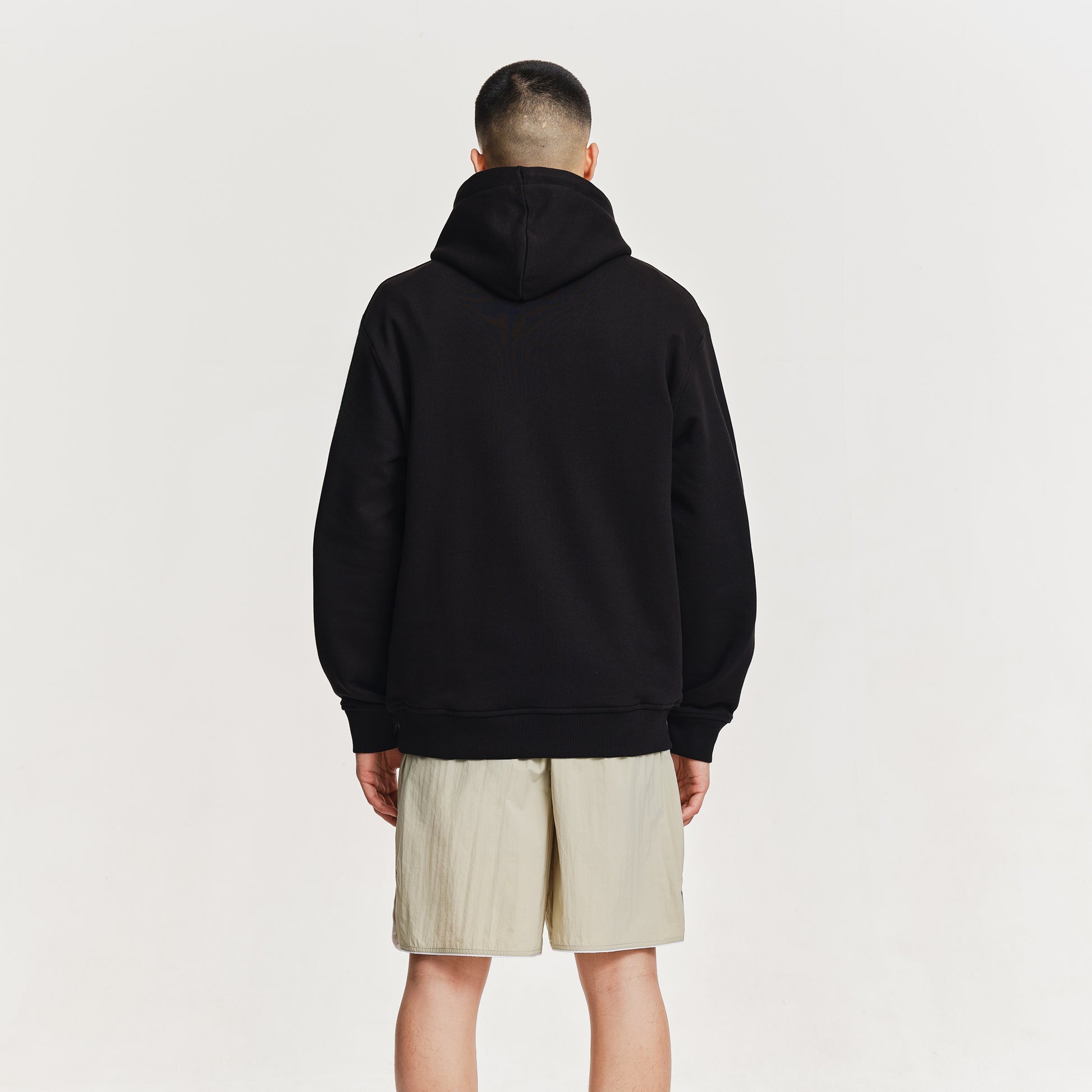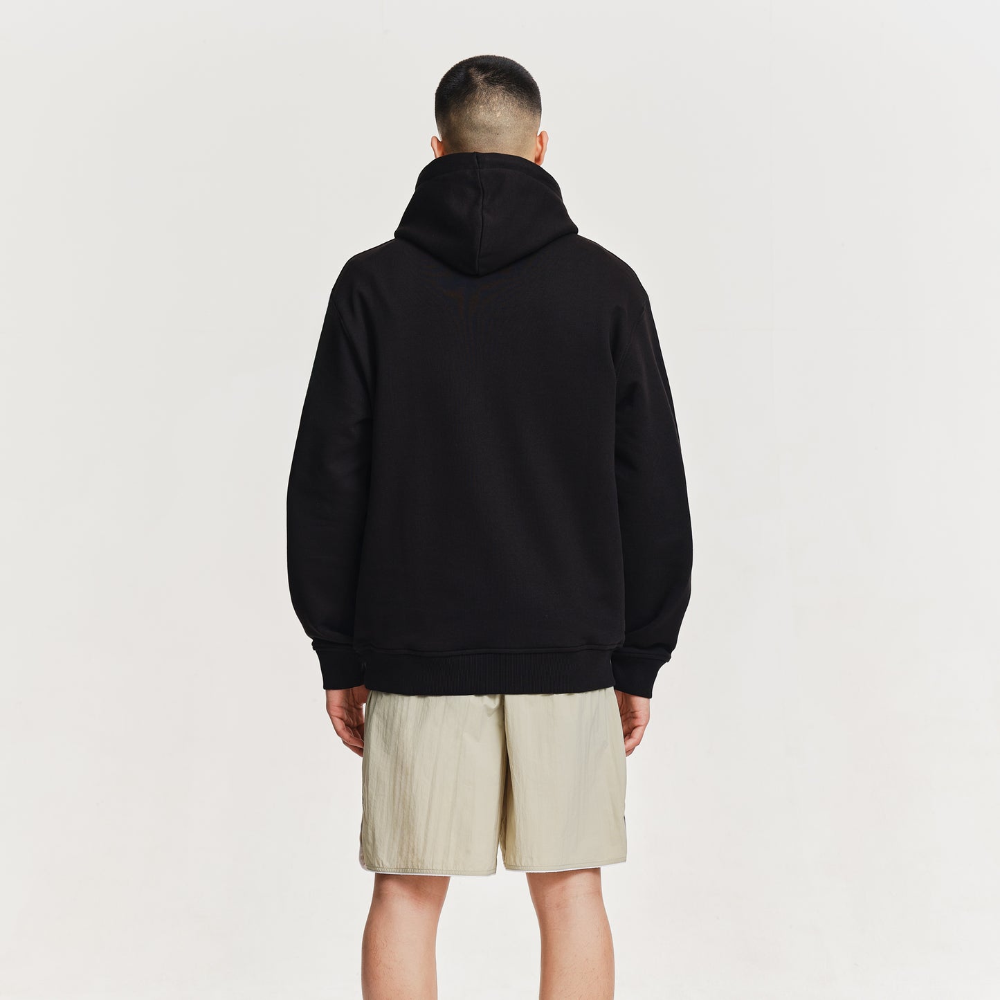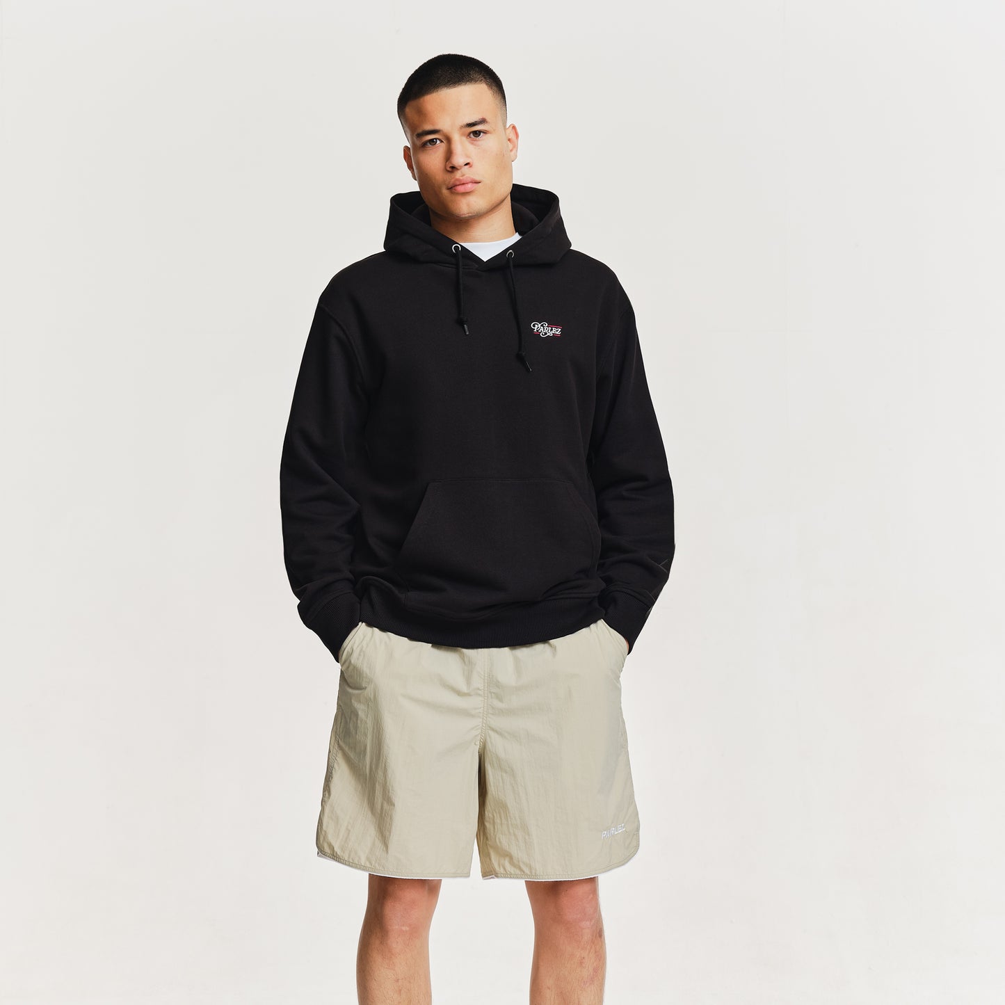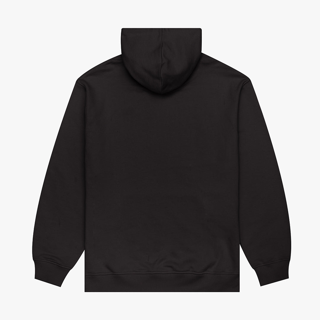 The Gratis Hoodie in Black. A loopback hoodie made from a soft, organic cotton and recycled poly blend. Featuring a classic kangaroo pocket, ribbed trims and a drawstring hood. Detailed with an embroidered logo on the chest.