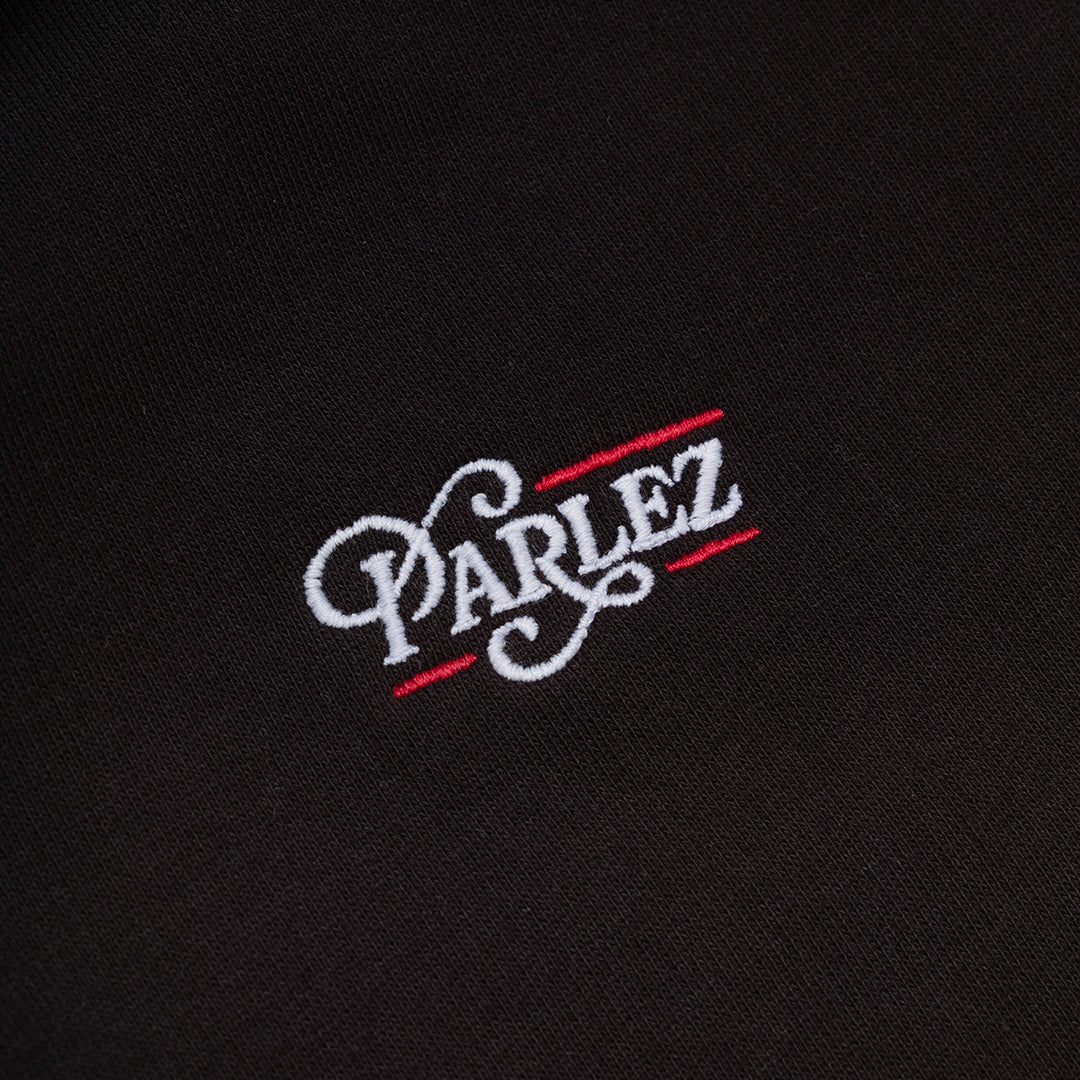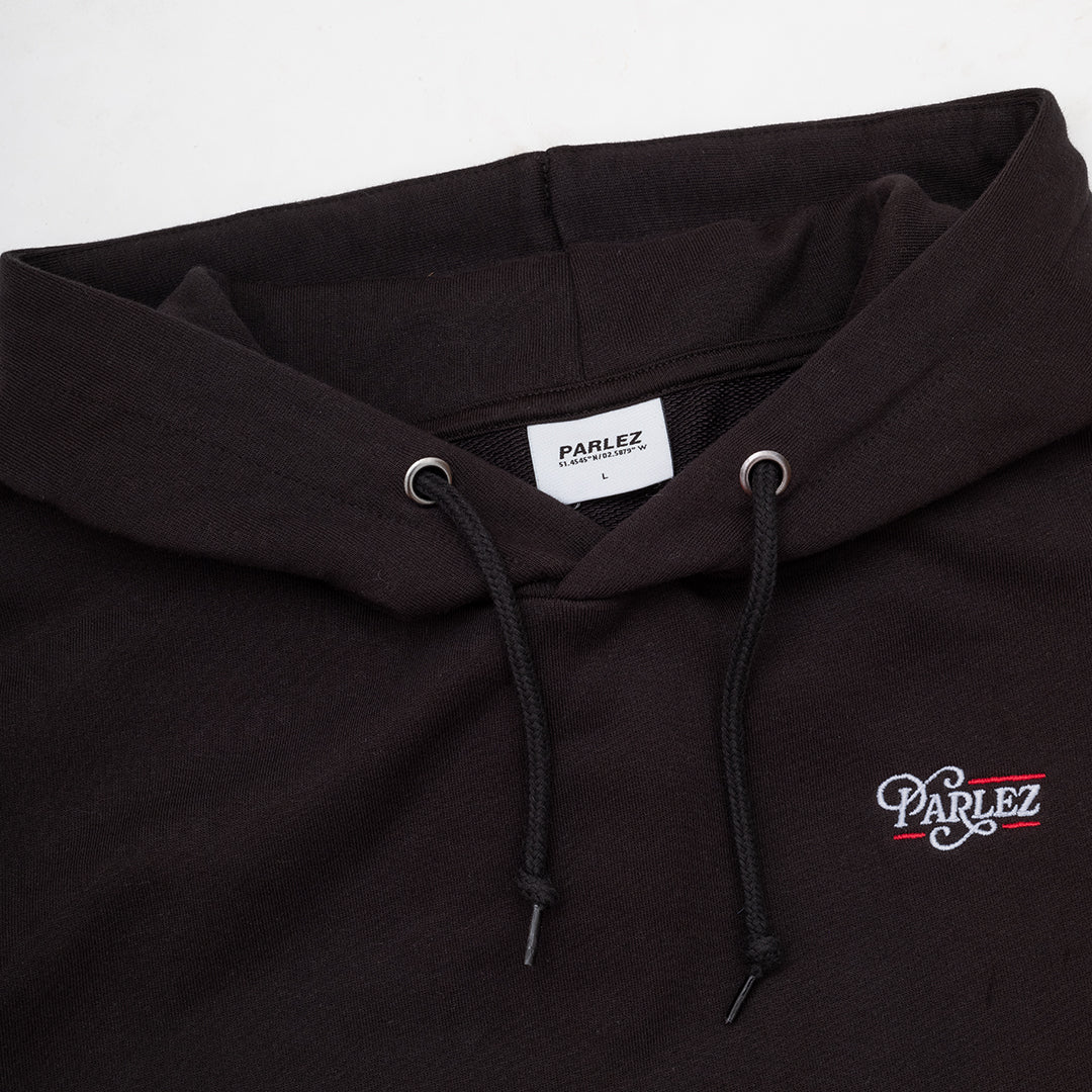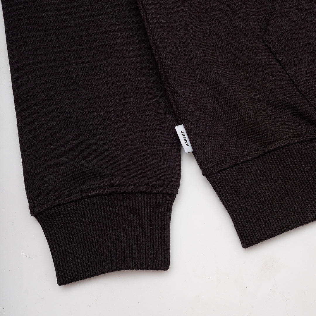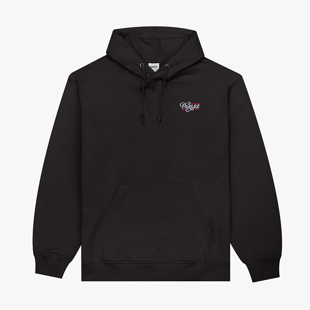 The Gratis Hoodie in Black. A loopback hoodie made from a soft, organic cotton and recycled poly blend. Featuring a classic kangaroo pocket, ribbed trims and a drawstring hood. Detailed with an embroidered logo on the chest.