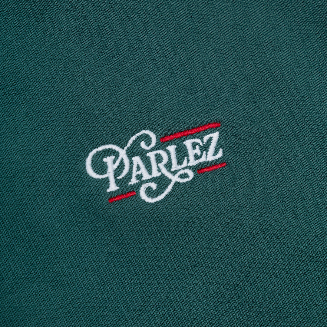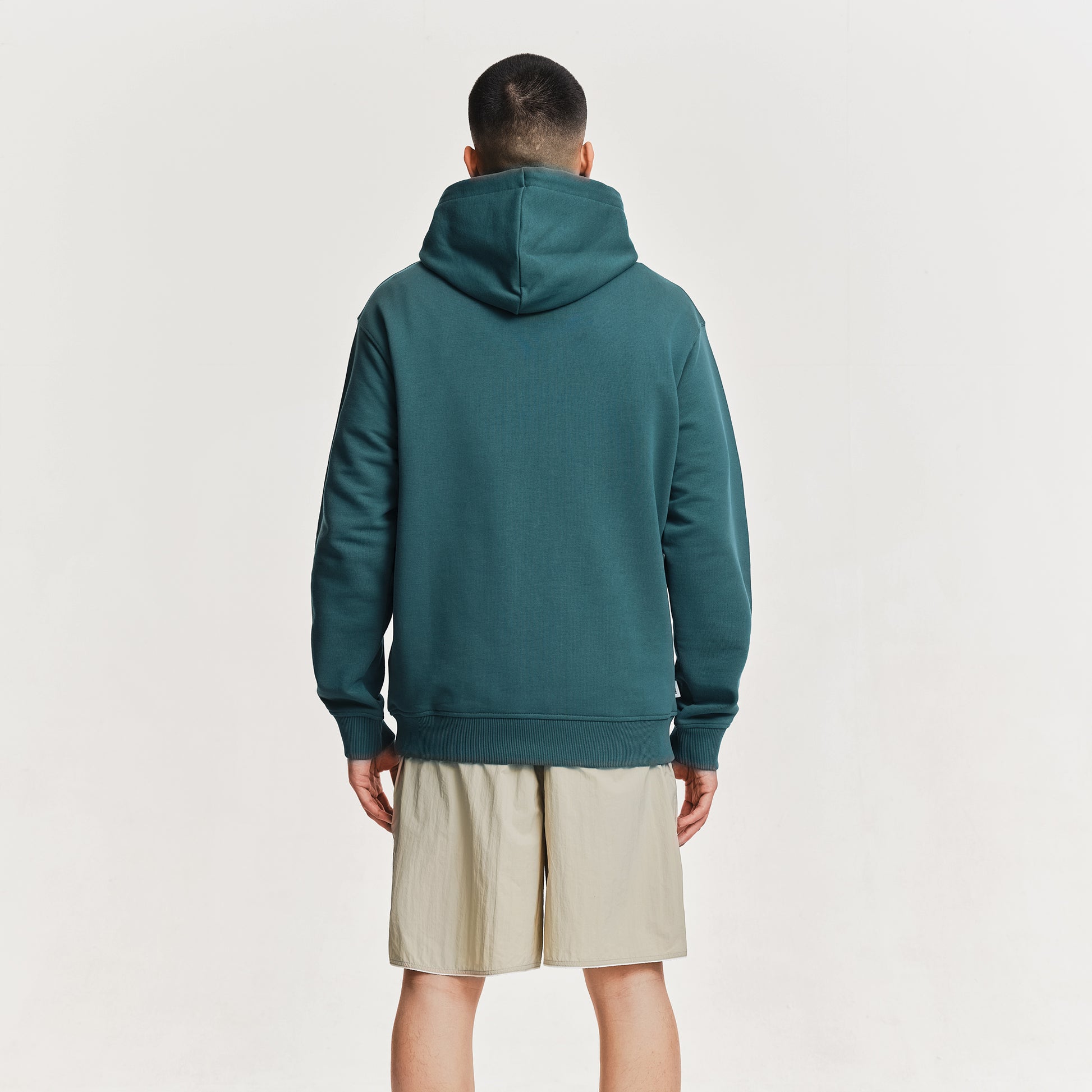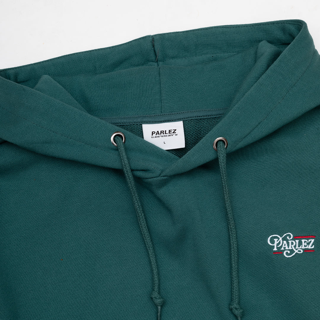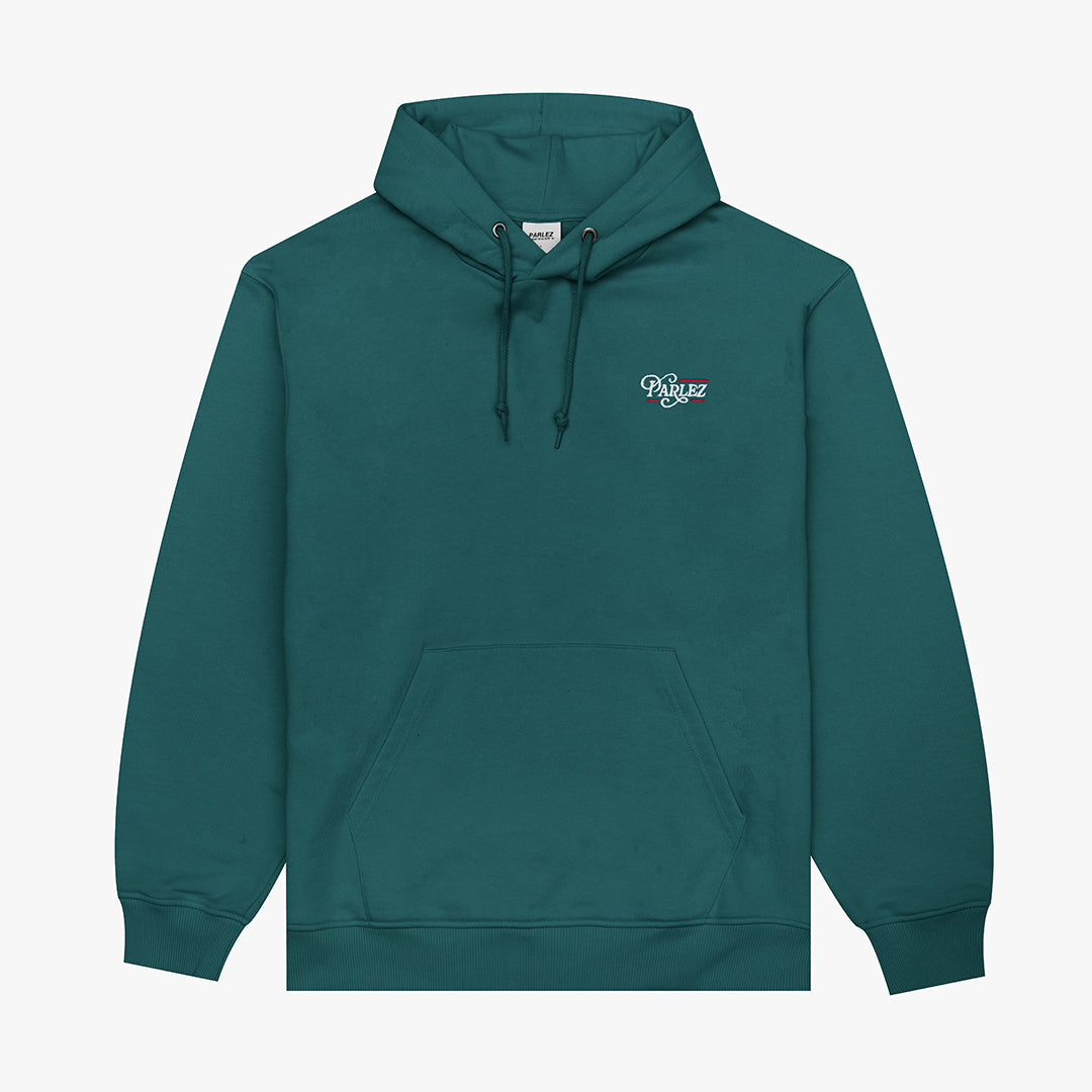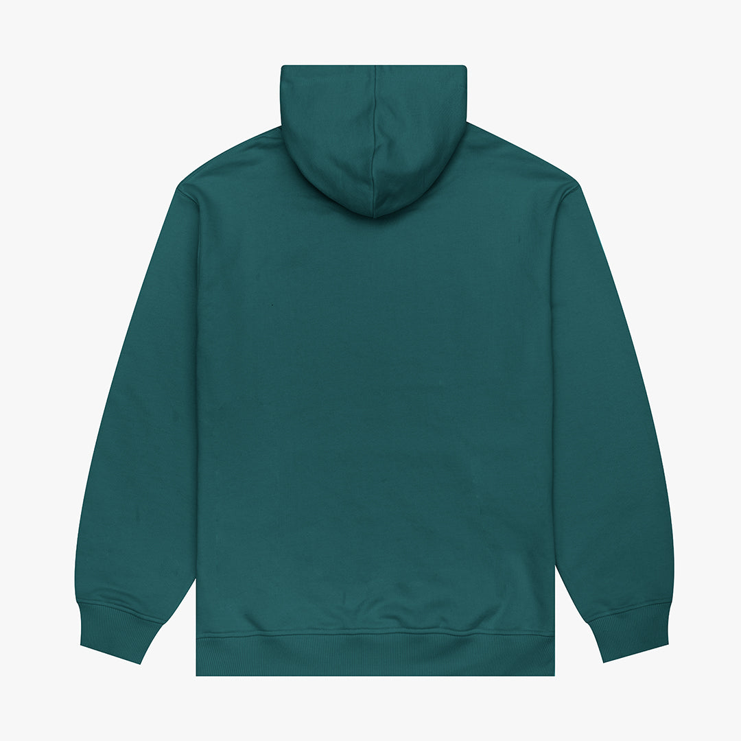 The Gratis Hoodie in Pacific Green. A loopback hoodie made from a soft, organic cotton and recycled poly blend. Featuring a classic kangaroo pocket, ribbed trims and a drawstring hood. Detailed with an embroidered logo on the chest.