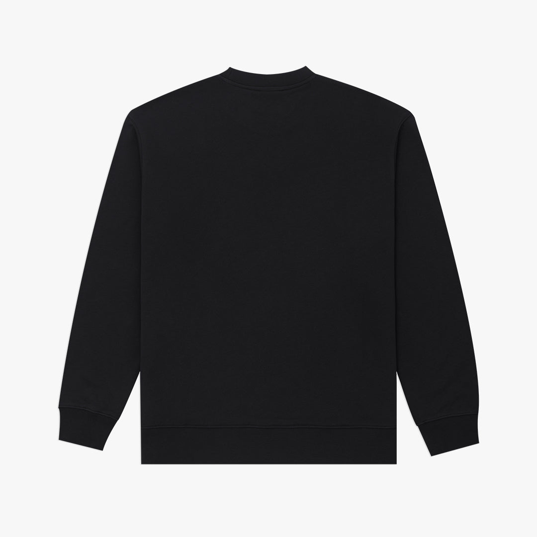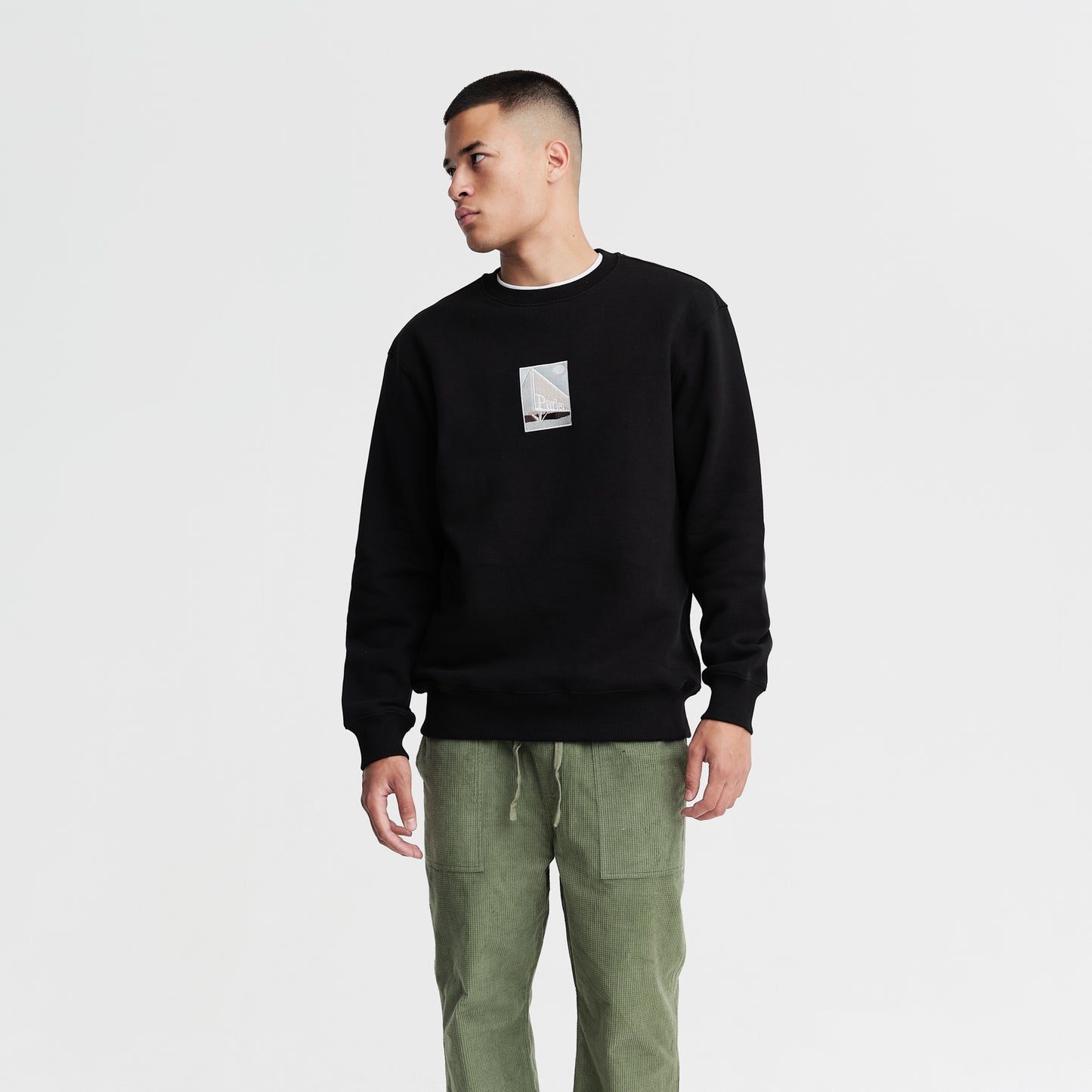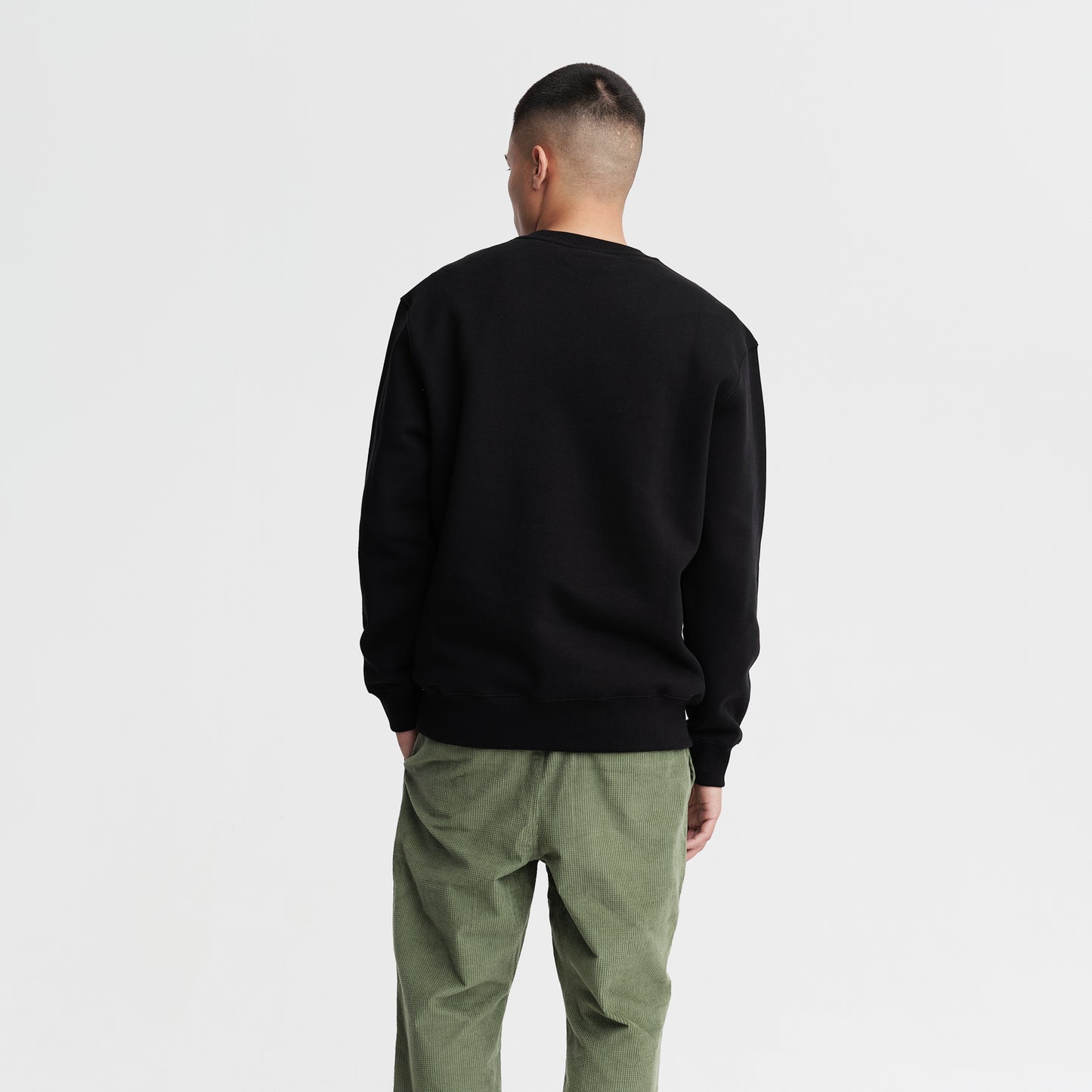 The Longwood Sweat in Black. A brushed back pullover made from soft, GOTS certified 100% organic cotton. Featuring a classic ribbed crewneck, drop-shoulder and ribbed trims. Detailed with an embroidered design on the chest.
