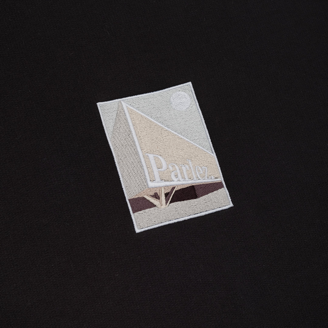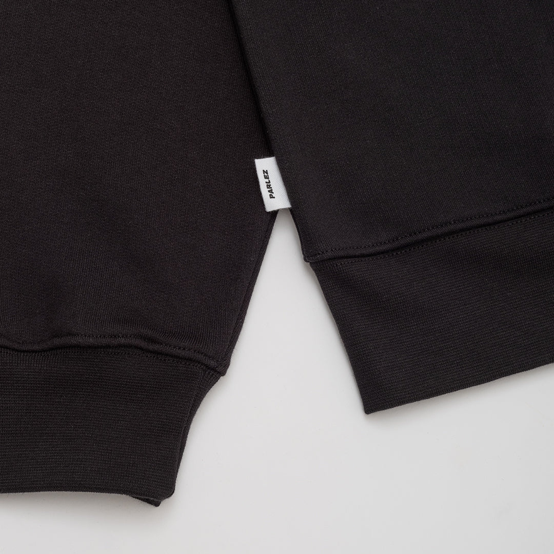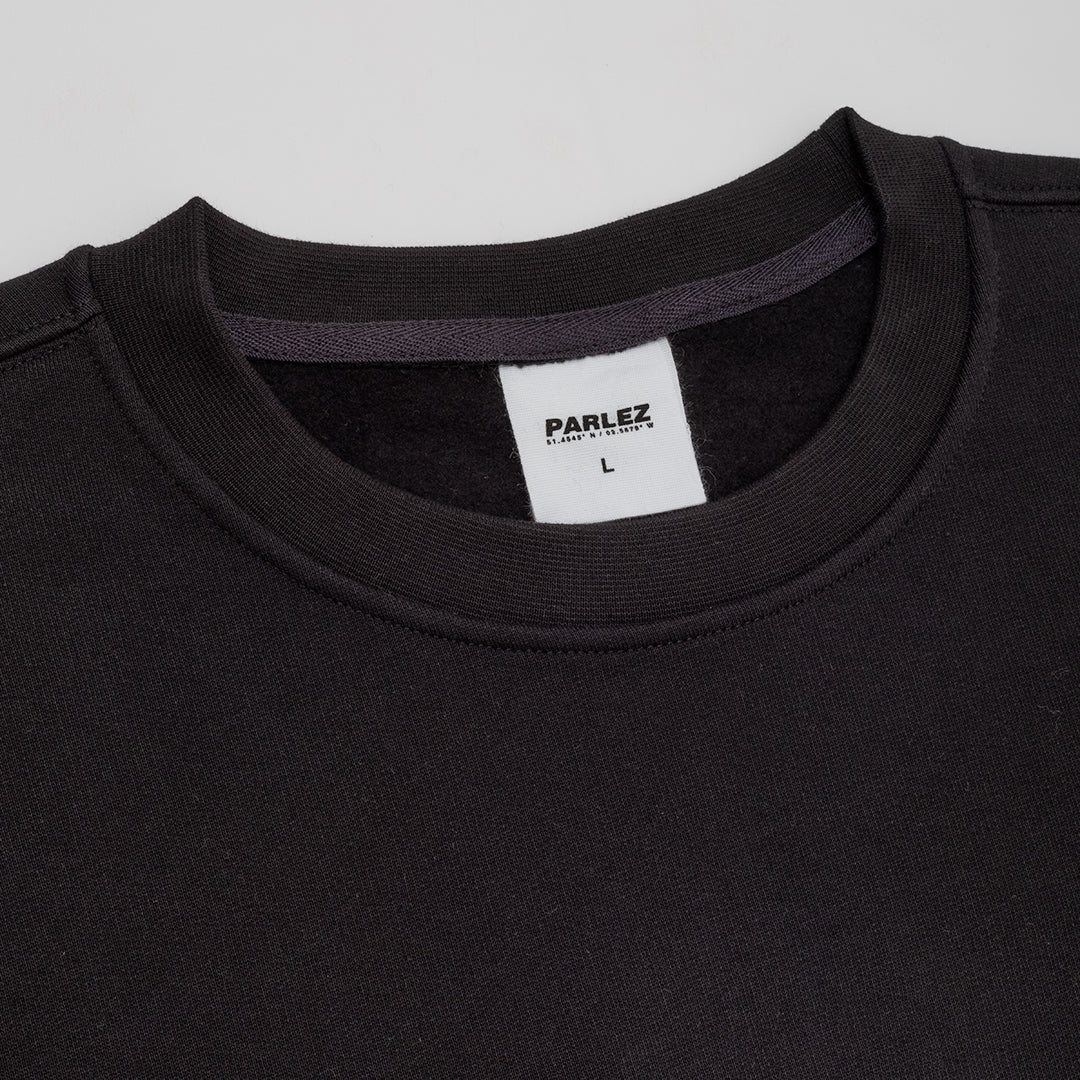 The Longwood Sweat in Black. A brushed back pullover made from soft, GOTS certified 100% organic cotton. Featuring a classic ribbed crewneck, drop-shoulder and ribbed trims. Detailed with an embroidered design on the chest.