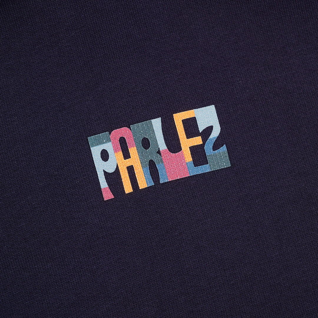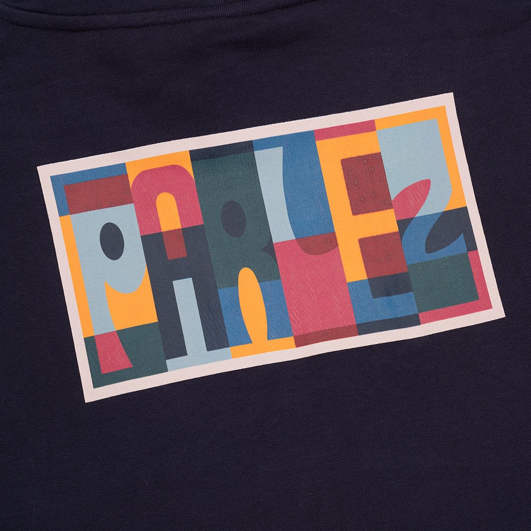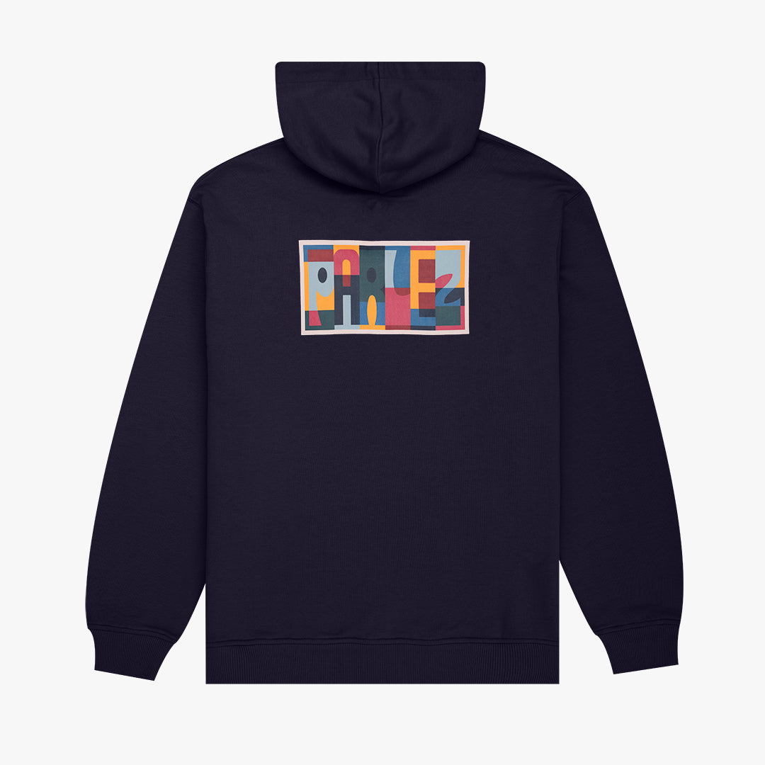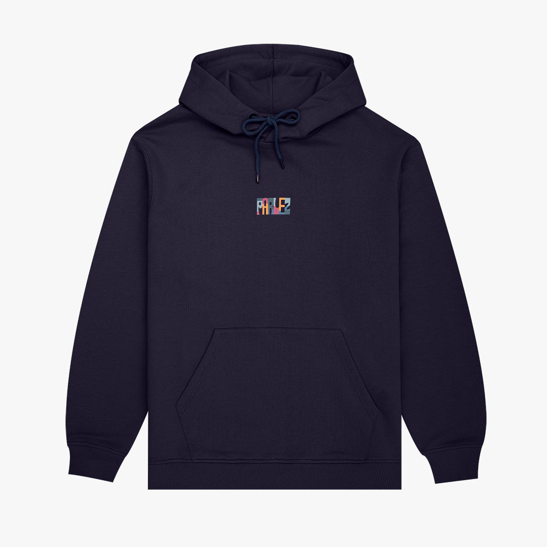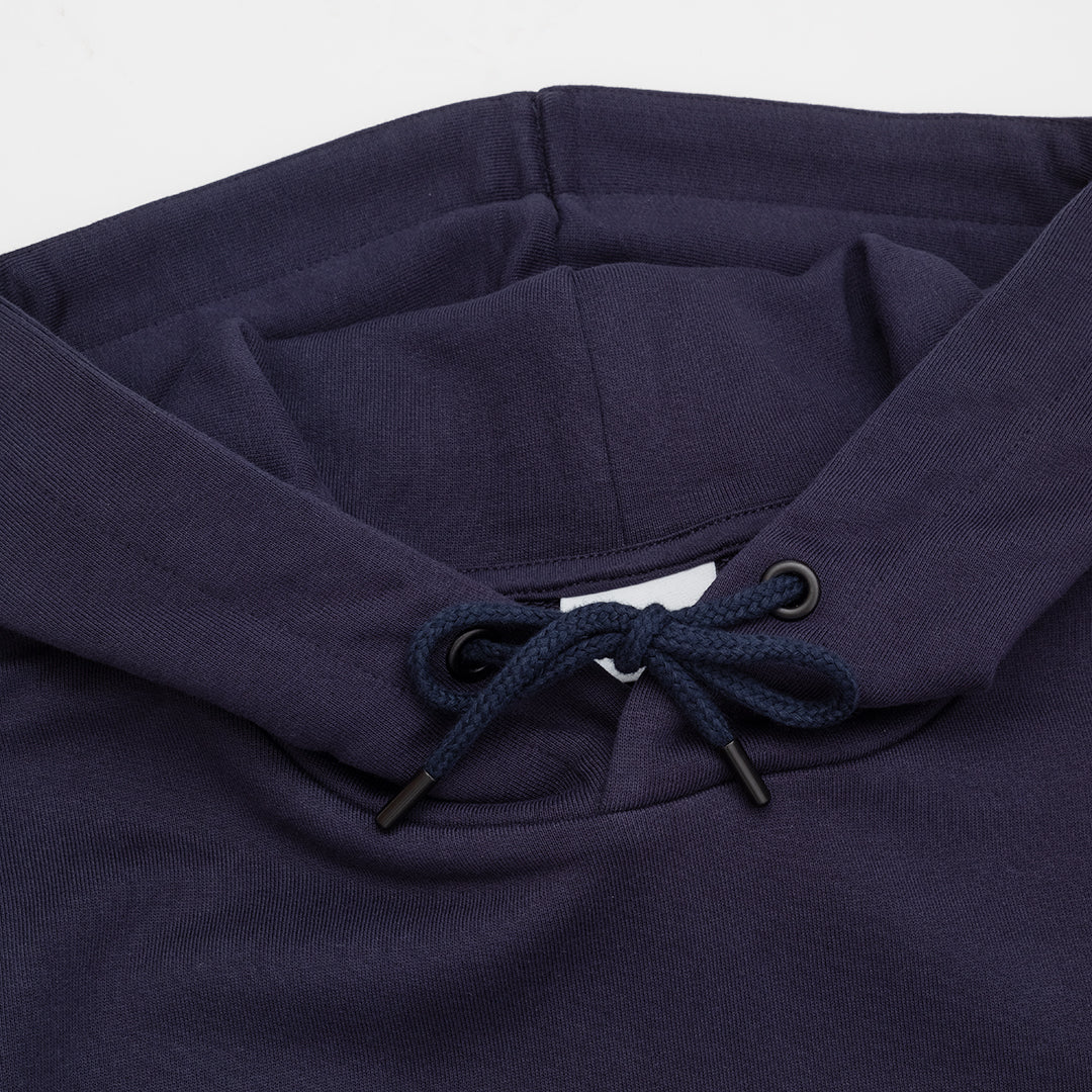 The Maddox Hood in Midnight. A pullover hoodie made from 80% Organic Cotton / 20% Recycled Polyester 350gsm loopback material. Featuring a classic pouch pocket, drawstring hood with metal aglets and ribbed trims. Detailed with a printed design on the chest and a larger print on the back.