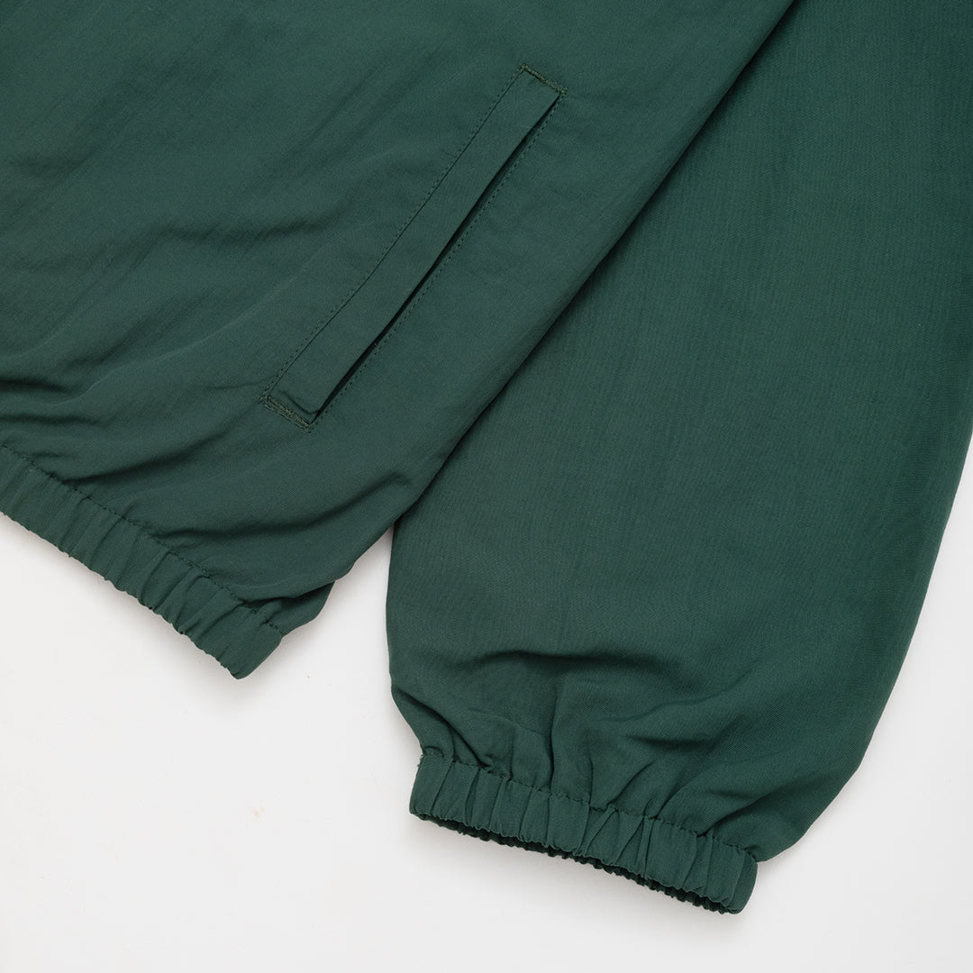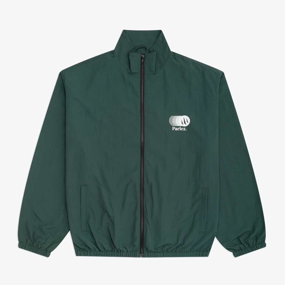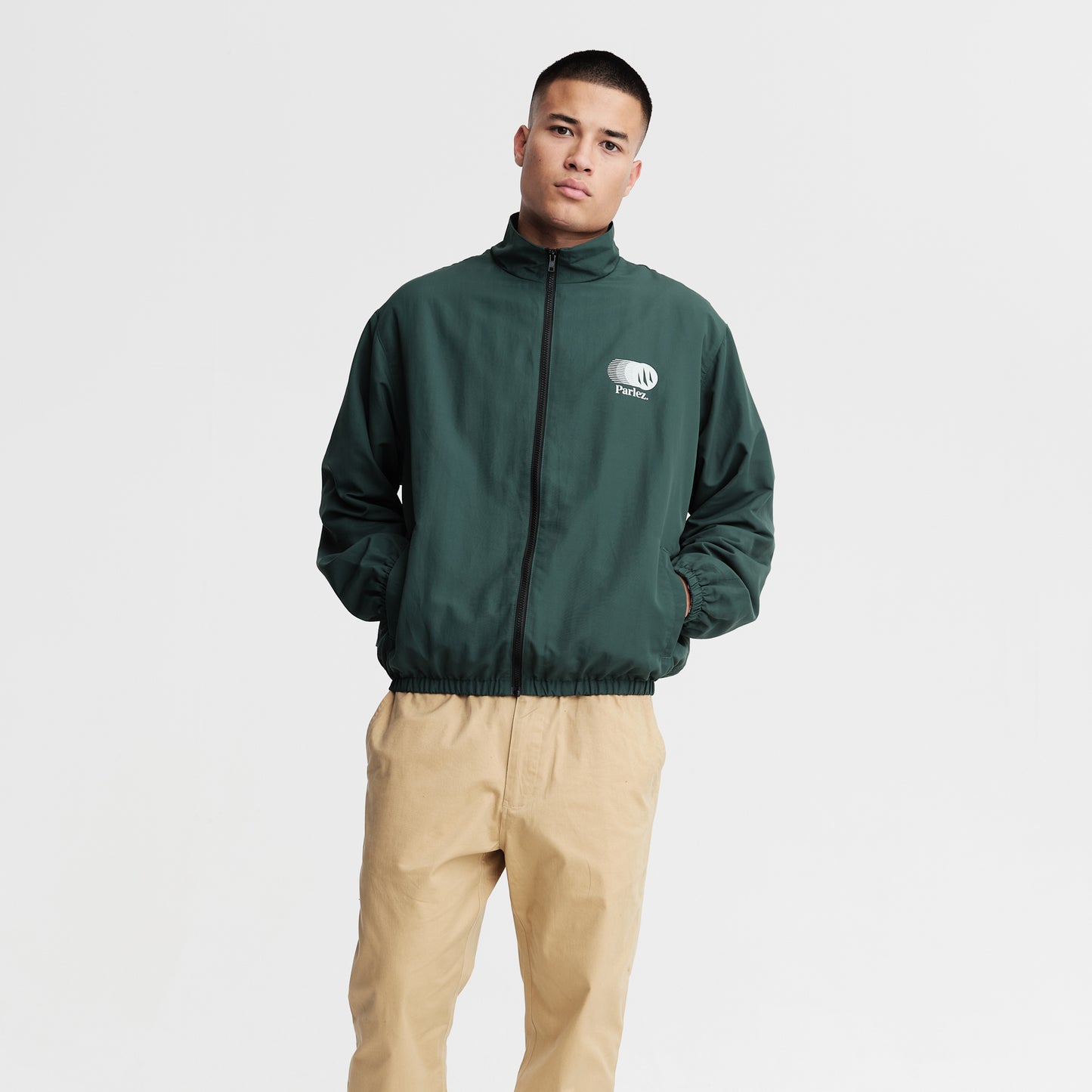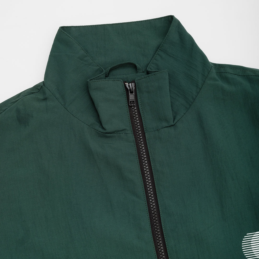 The Myrtle Track Top in Deep Green. A classic zip-through Track Jacket made from 100% recycled nylon with full mesh lining. Featuring elasticated cuffs and hem, two side entry pockets and a stand collar. Detailed with printed branding on the chest and a large graphic print on the back.