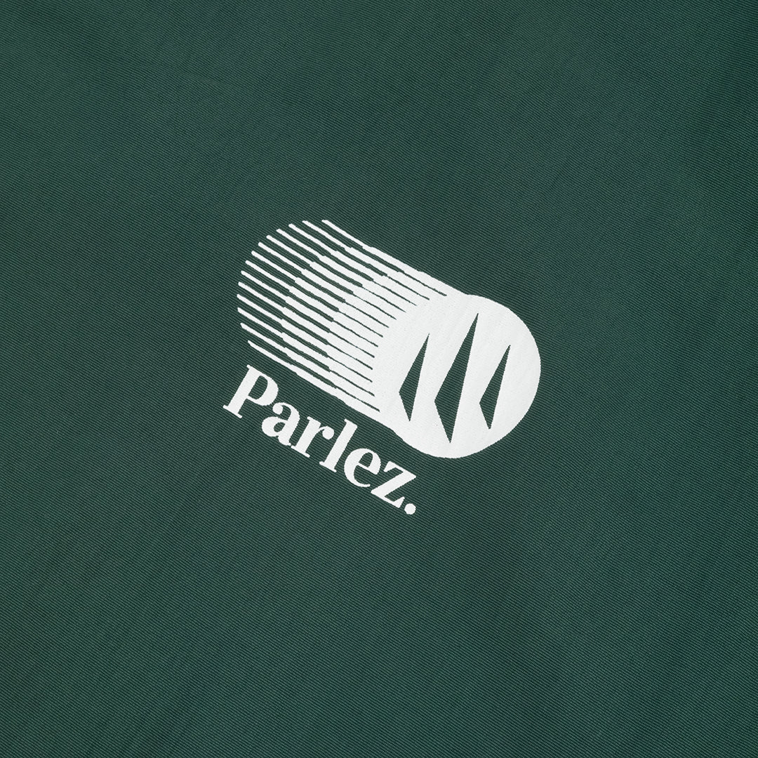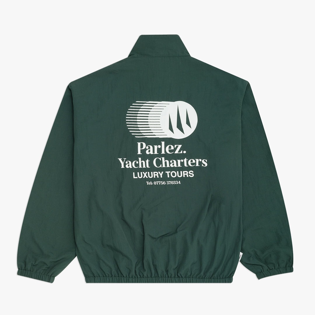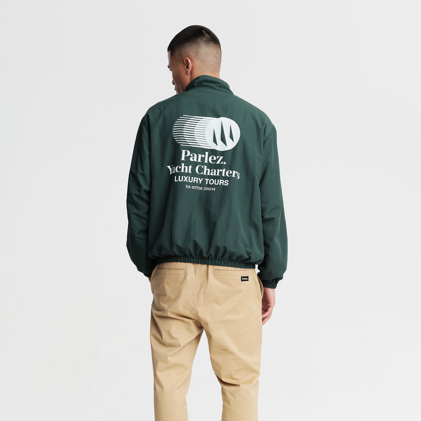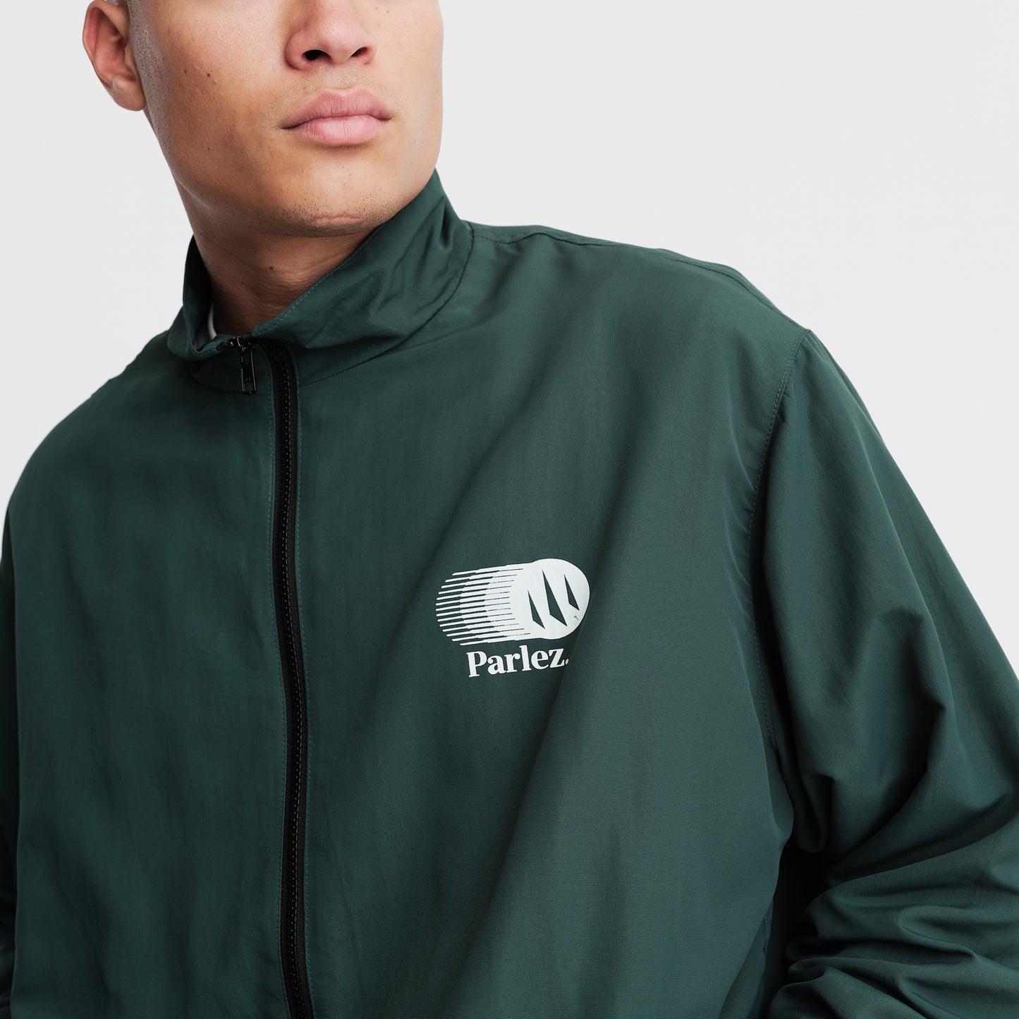 The Myrtle Track Top in Deep Green. A classic zip-through Track Jacket made from 100% recycled nylon with full mesh lining. Featuring elasticated cuffs and hem, two side entry pockets and a stand collar. Detailed with printed branding on the chest and a large graphic print on the back.