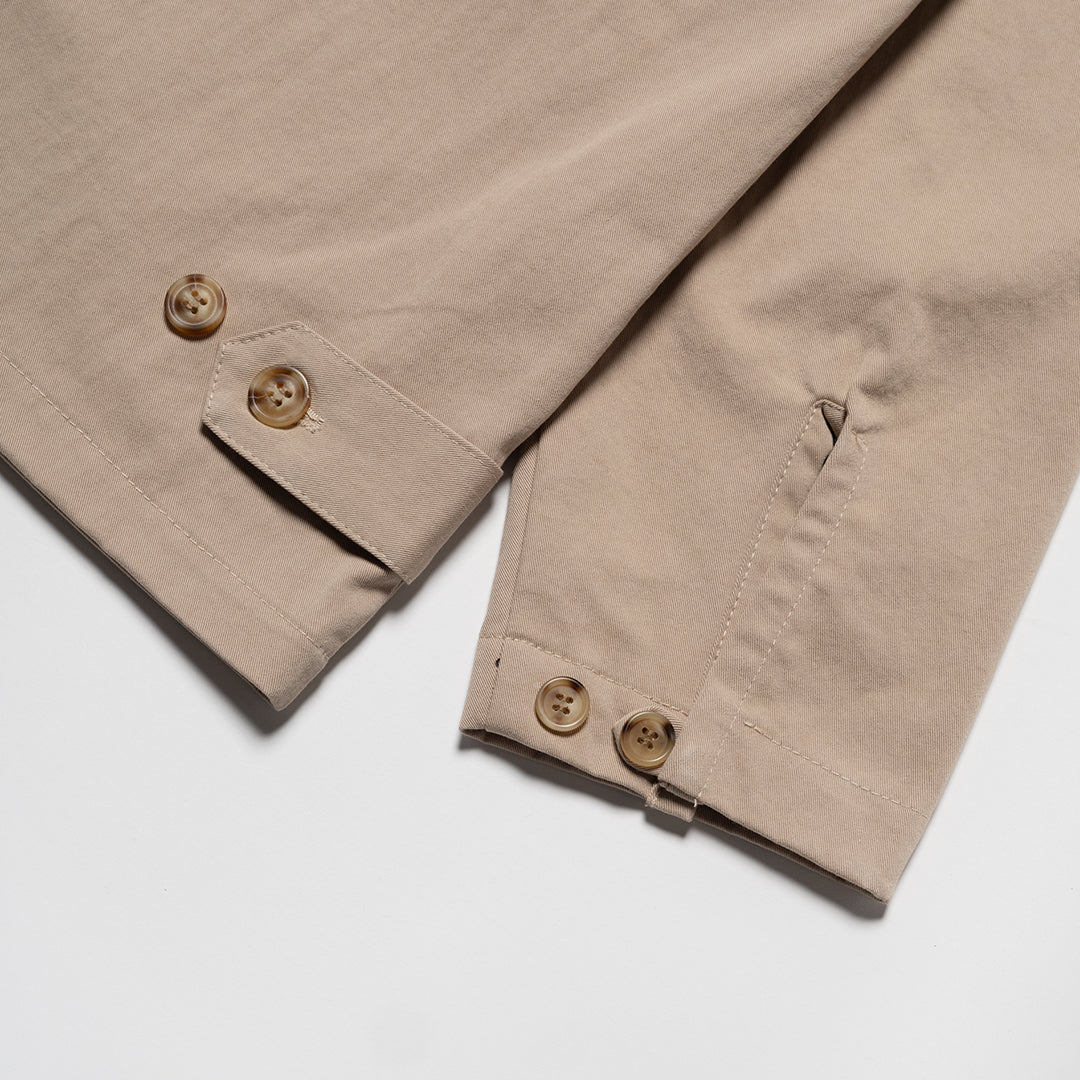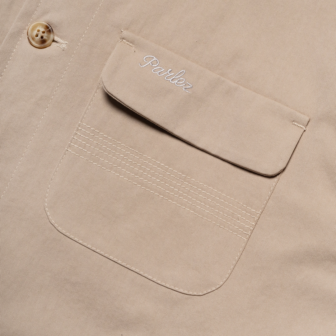 The Paris Jacket in Hops. A button-through overshirt with a classic spread collar, made from premium 100% organic cotton twill. Featuring dual chest pockets, two vertical welt pockets and adjustable button cuffs. Detailed with embroidered script branding and stitching detail at the pocket.