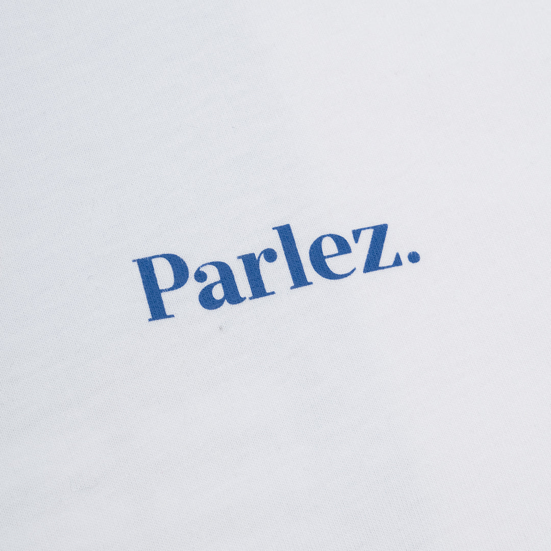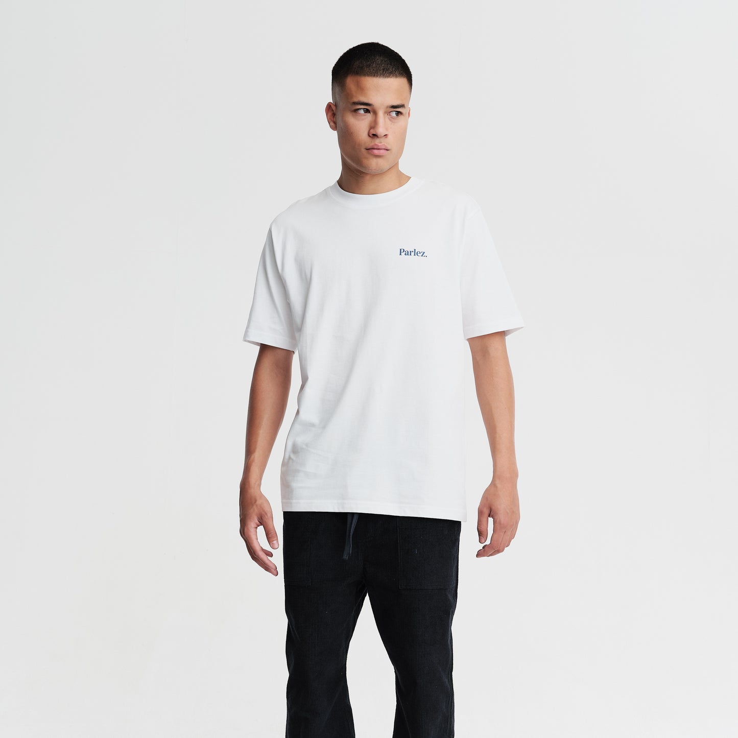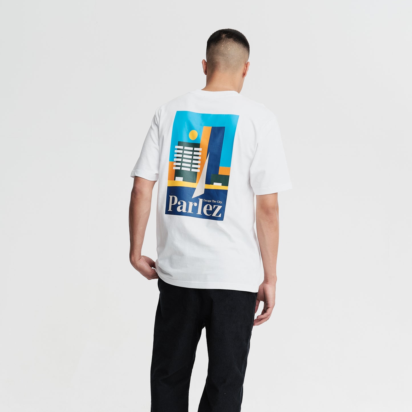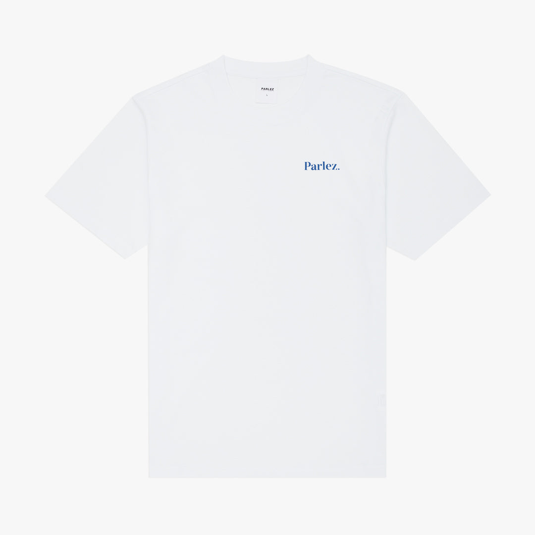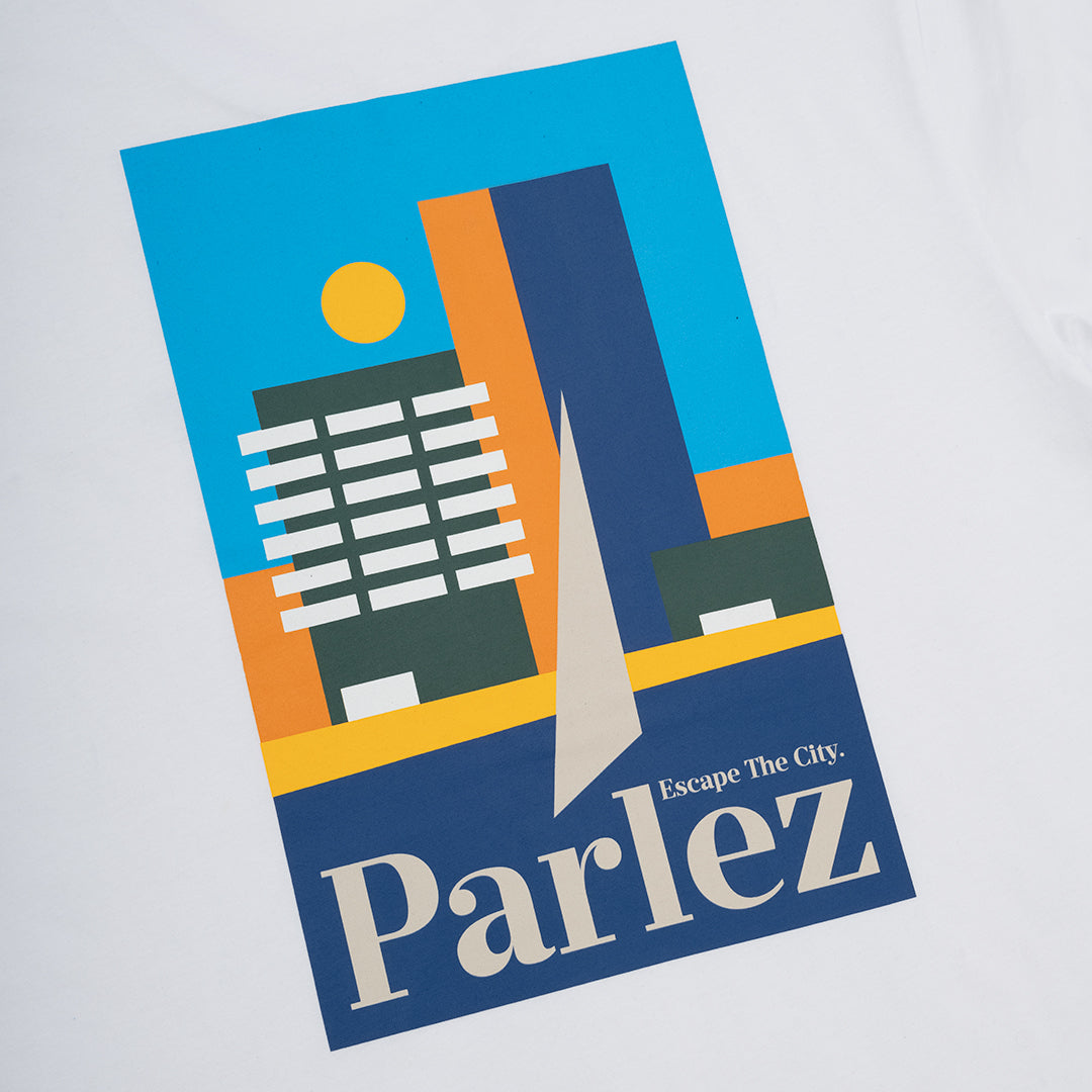 The Ragley T-Shirt in White. A short sleeve tee constructed from premium, GOTS Certified 100% organic cotton with a classic ribbed crewneck. Featuring a printed logo on the chest and a large printed city scape graphic on the back.