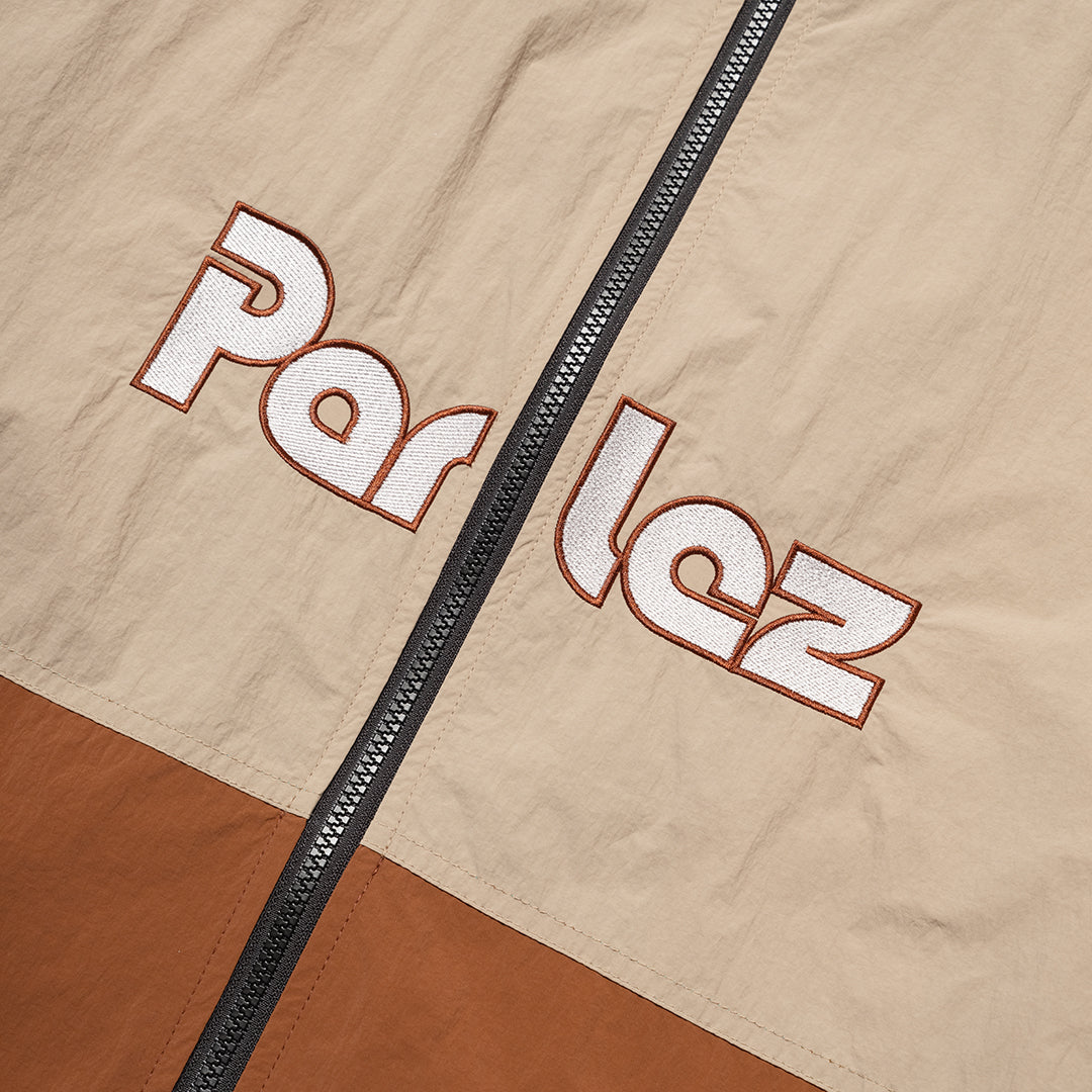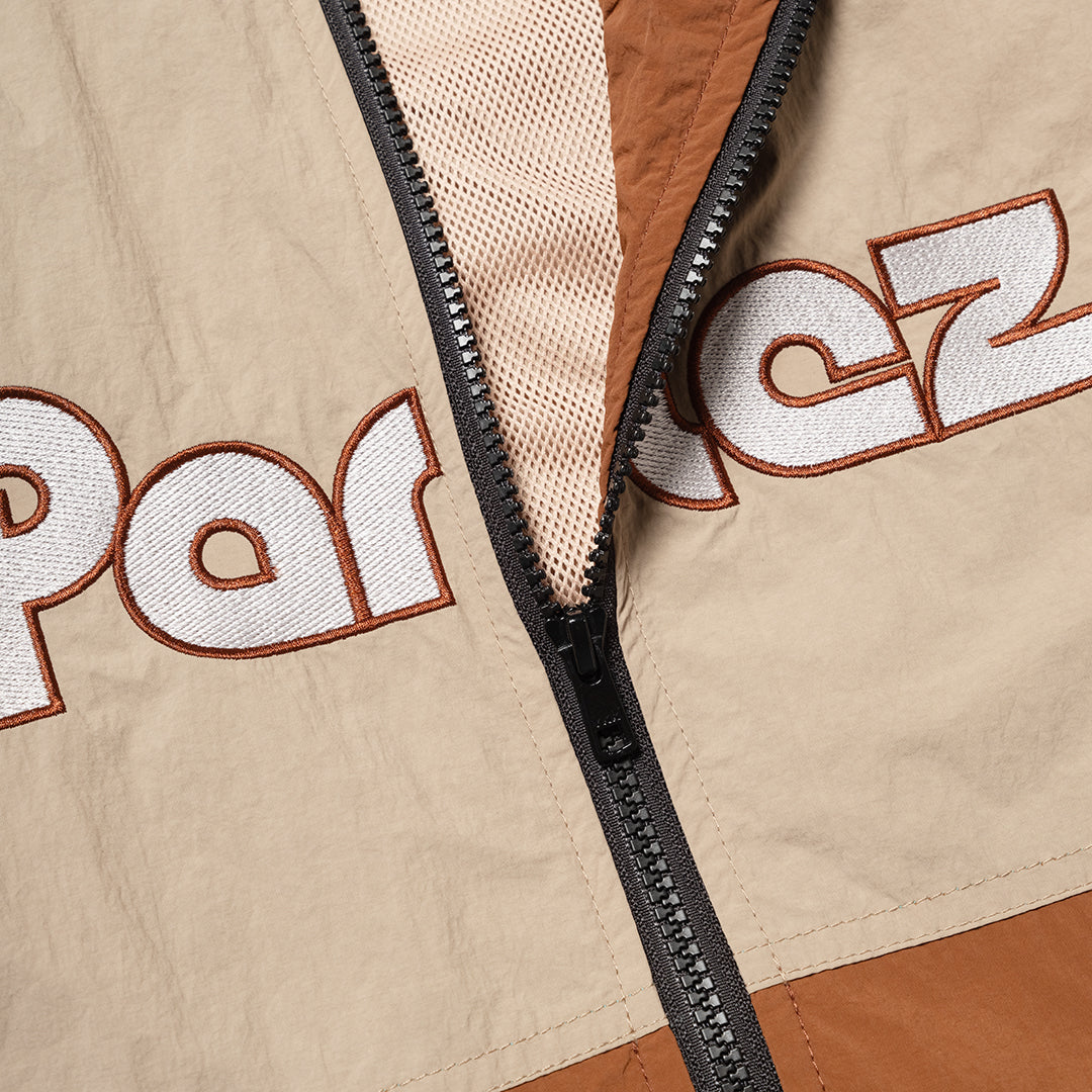 The Rail Track Jacket in Hops. A zip-through track jacket with tri-colour panelling, made from 100% recycled nylon with a full mesh lining. Designed with two welt pockets, a bungee cord hem for an adjustable fit and a stand collar. Detailed with an appliqué branding across the chest.