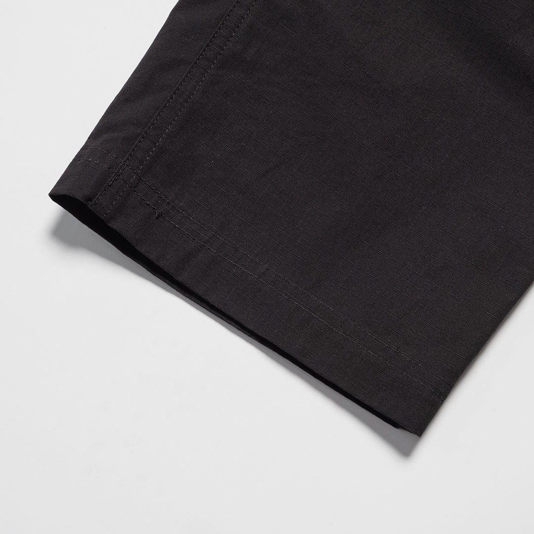 The Seabright Trousers in Black. Relaxed-fit, tapered trousers crafted from durable 100% organic cotton ripstop. Designed with an elasticated drawstring waist, two side-entry pockets, and two back welt pockets. Finished with a branded woven patch on the back pocket.