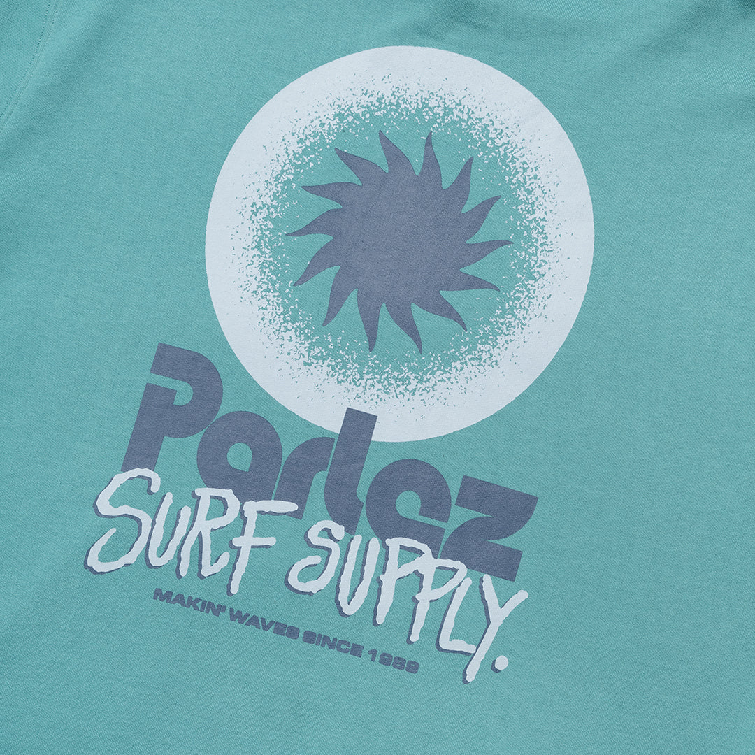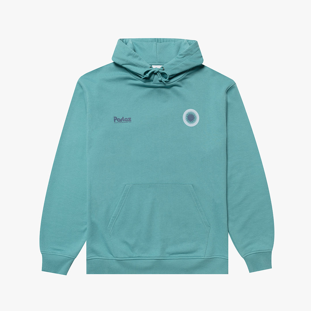 The Submerge Hoodie in Leaf. A loopback hoodie crafted from a premium organic cotton and recycled polyester blend. Designed with elasticated ribbed trims, a kangaroo pouch pocket, and an adjustable drawstring hood. Finished with printed branding on the chest and a large print on the back.