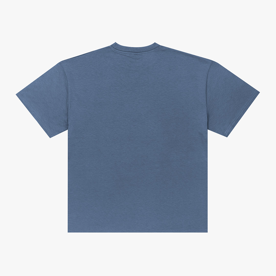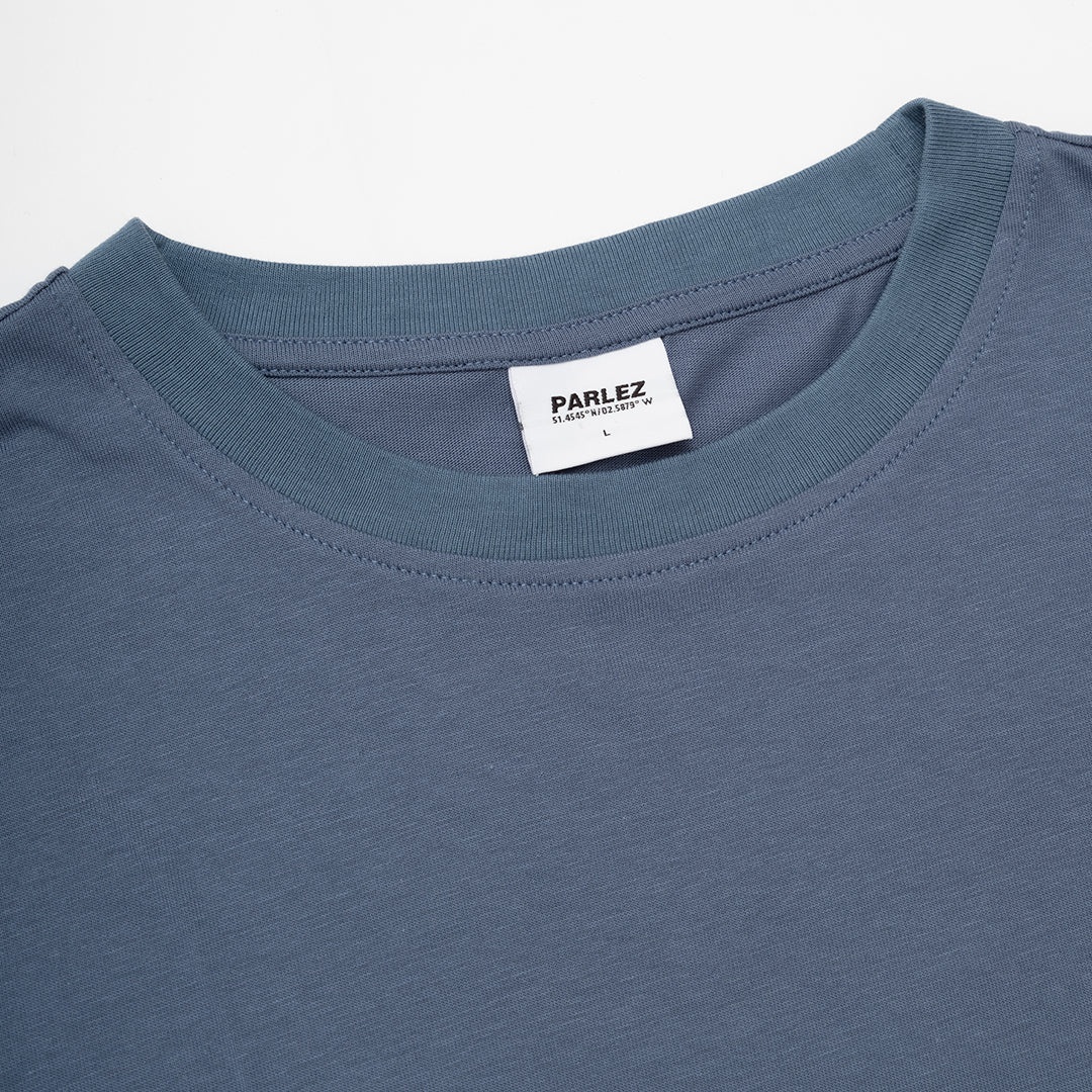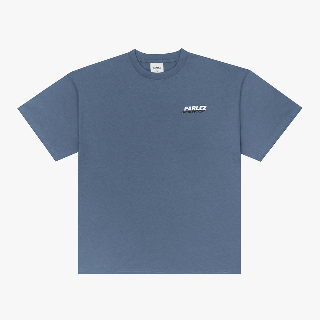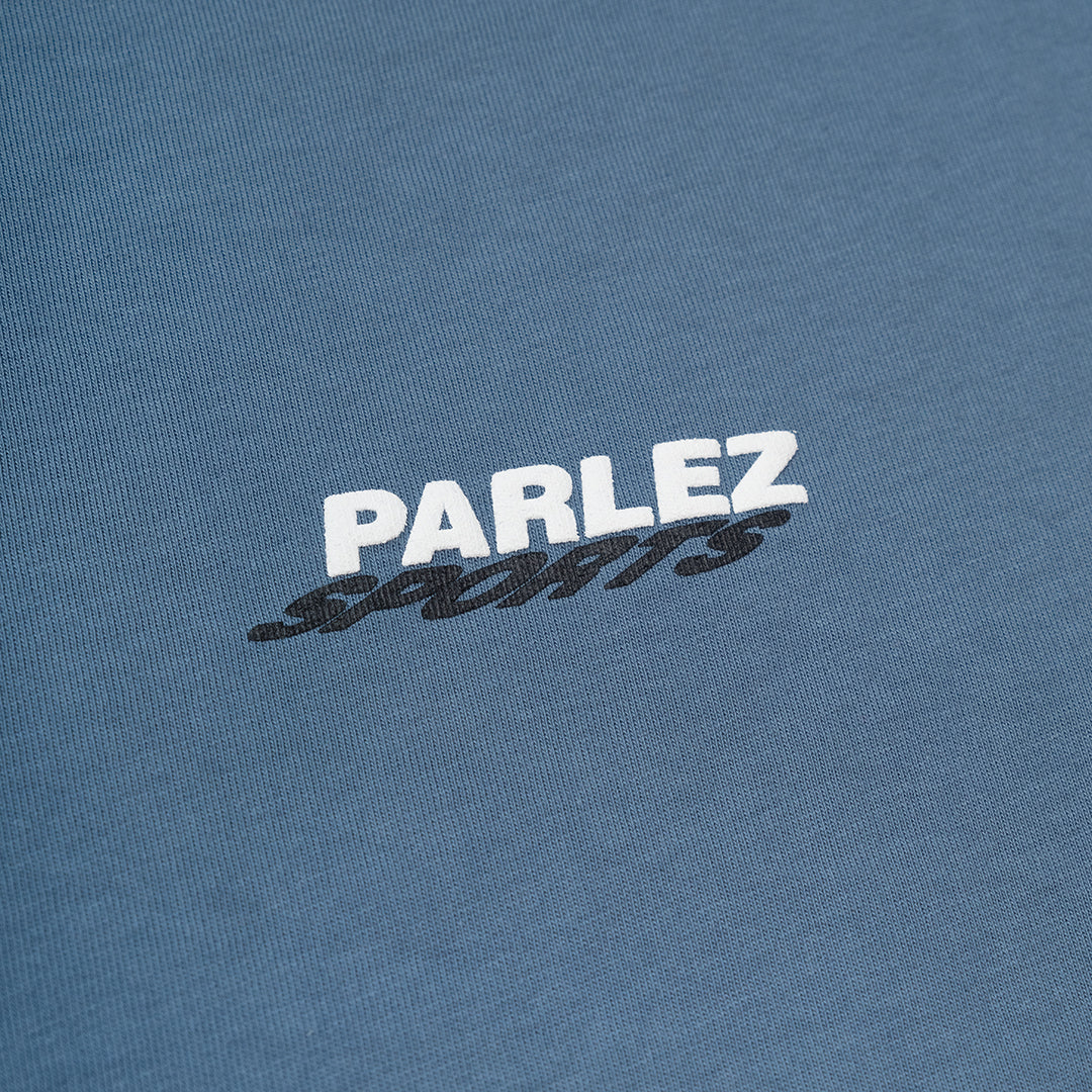 The Umbra T-Shirt in China Blue. A short sleeve, oversized tee constructed from premium 100% organic cotton with a classic ribbed crewneck. Finished with a printed Parlez Sports motif on the chest.