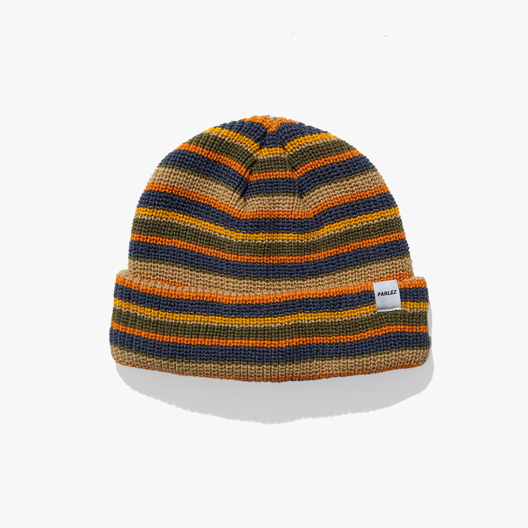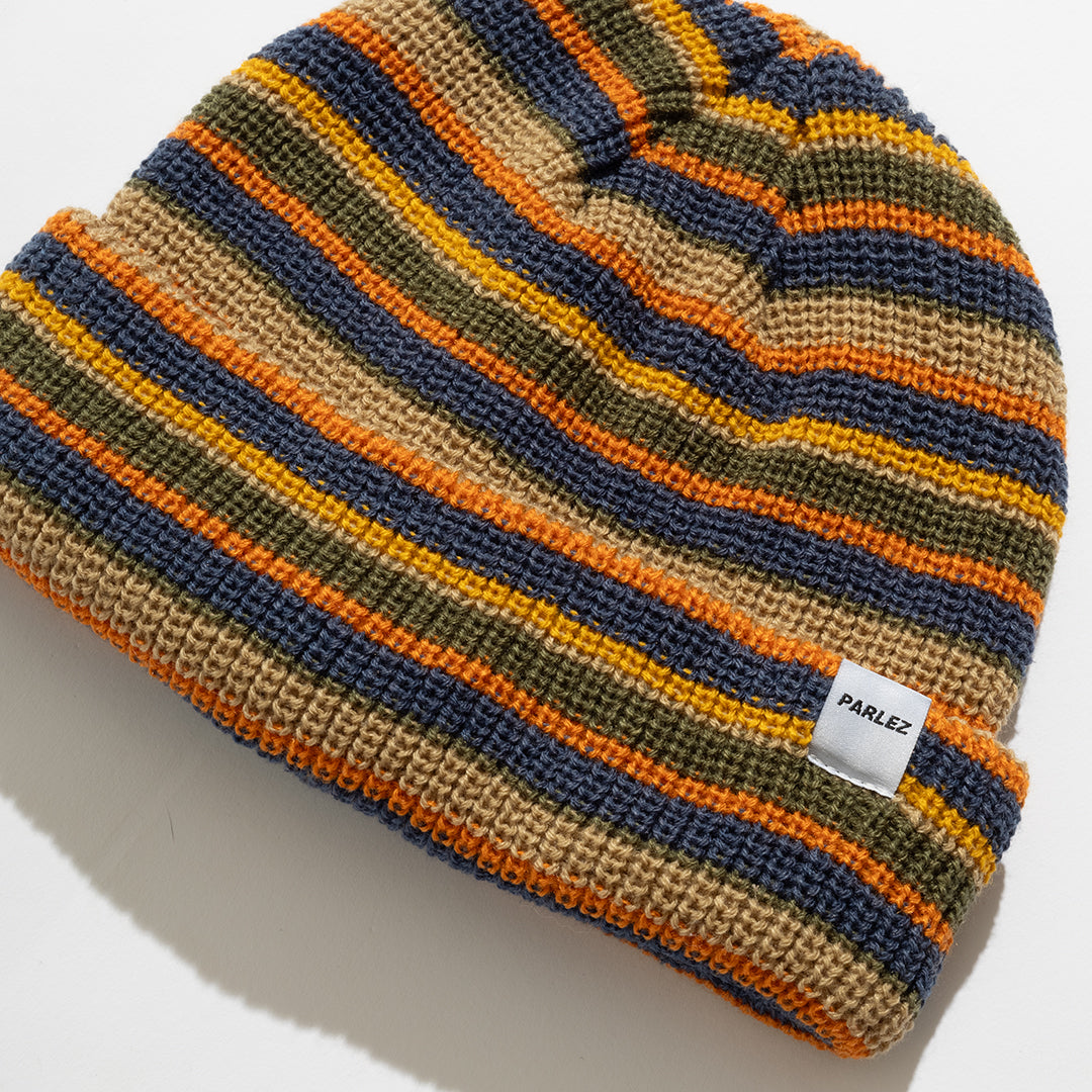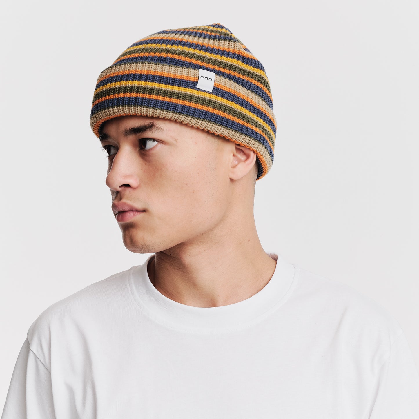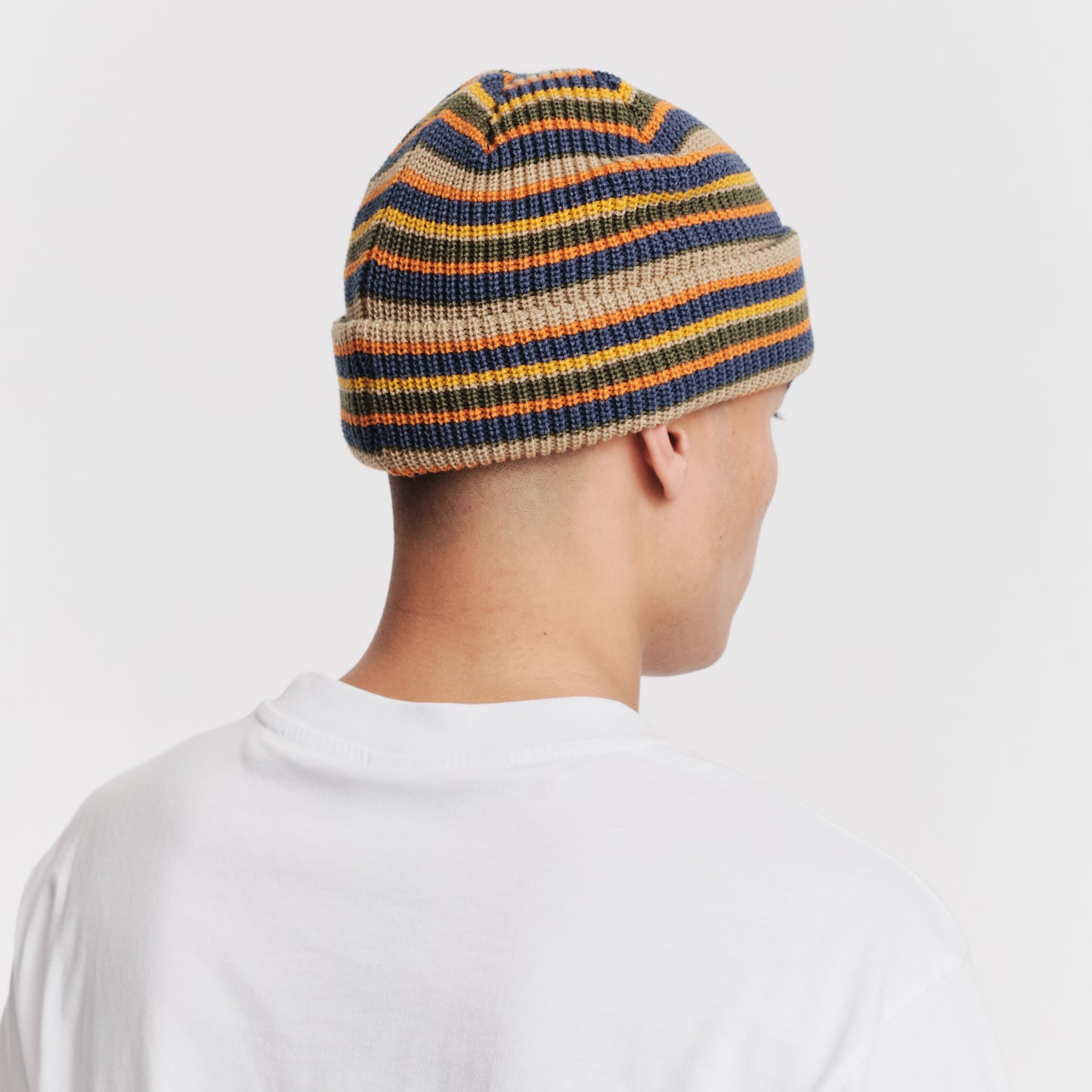 The Verdi Beanie Hat in Golden Multi. A short-roll, ribbed beanie made from a soft Acrylic fabric with an all-over stripe. Featuring a branded woven label on the brim.